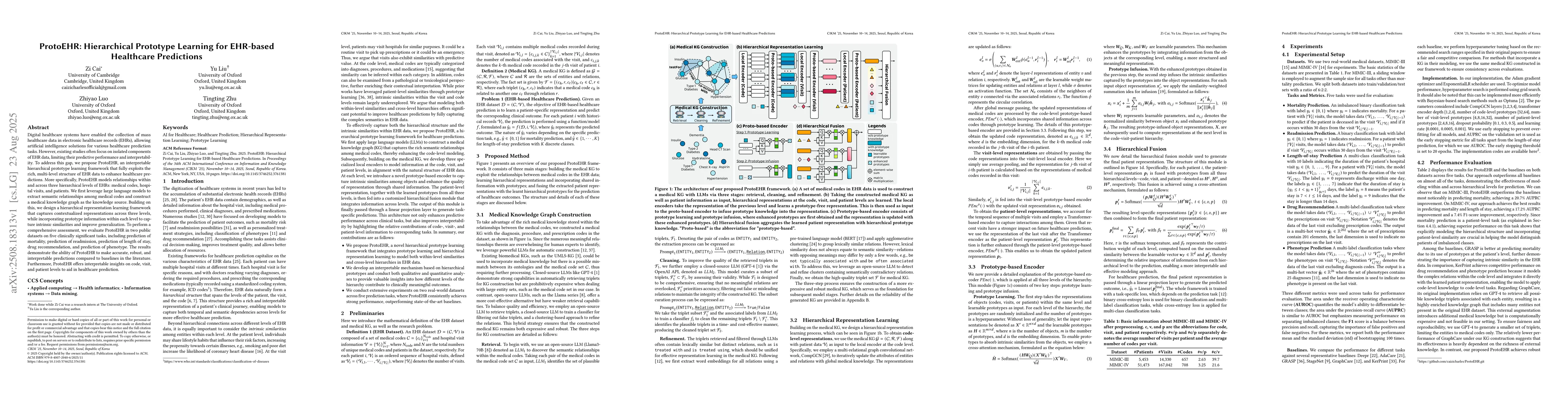 Digital healthcare systems have enabled the collection of mass healthcare data in electronic healthcare records (EHRs), allowing artificial intelligence solutions for various healthcare prediction tasks. However, existing studies often focus on isolated components of EHR data, limiting their predictive performance and interpretability. To address this gap, we propose ProtoEHR, an interpretable hierarchical prototype learning framework that fully exploits the rich, multi-level structure of EHR data to enhance healthcare predictions. More specifically, ProtoEHR models relationships within and across three hierarchical levels of EHRs: medical codes, hospital visits, and patients. We first leverage large language models to extract semantic relationships among medical codes and construct a medical knowledge graph as the knowledge source. Building on this, we design a hierarchical representation learning framework that captures contextualized representations across three levels, while incorporating prototype information within each level to capture intrinsic similarities and improve generalization. To perform a comprehensive assessment, we evaluate ProtoEHR in two public datasets on five clinically significant tasks, including prediction of mortality, prediction of readmission, prediction of length of stay, drug recommendation, and prediction of phenotype. The results demonstrate the ability of ProtoEHR to make accurate, robust, and interpretable predictions compared to baselines in the literature. Furthermore, ProtoEHR offers interpretable insights on code, visit, and patient levels to aid in healthcare prediction.