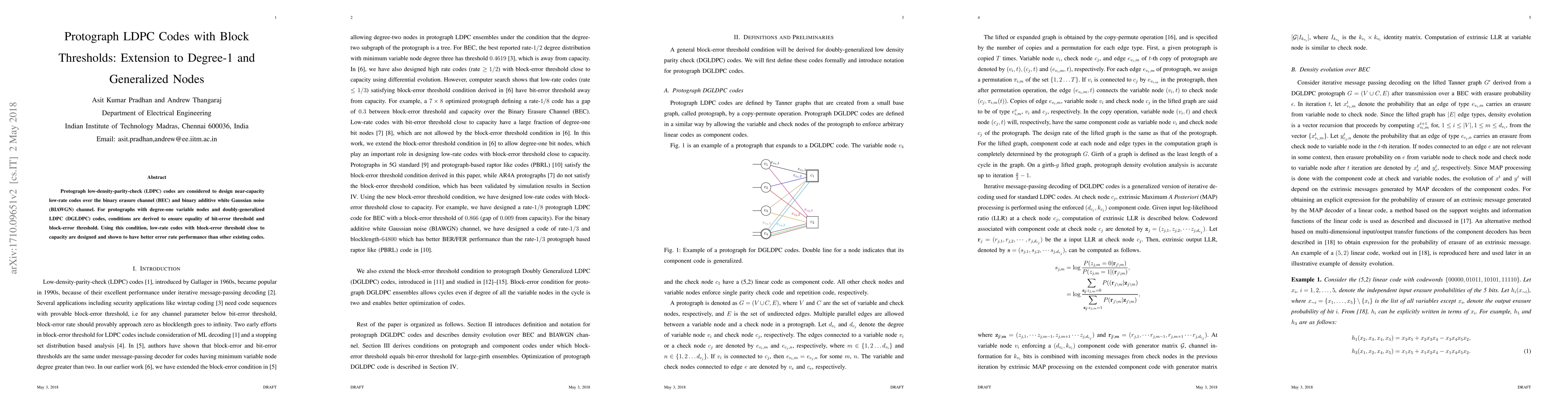 This paper extends protograph LDPC codes to degree-one variable nodes and generalized nodes, deriving conditions for matching bit-error and block-error thresholds. The resulting low-rate codes exhibit superior error rate performance compared to existing codes.