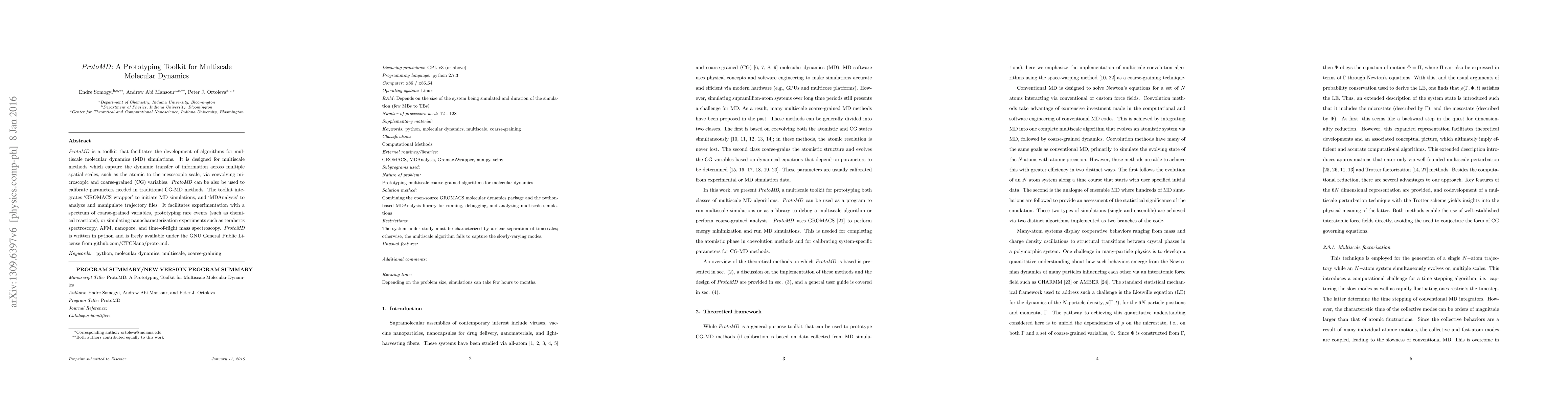 ProtoMD is a Python-based toolkit for developing and prototyping algorithms in multiscale molecular dynamics simulations, integrating tools like GROMACS and MDAnalysis for simulation and analysis. It supports calibration of parameters and experimentation with various coarse-grained variables.