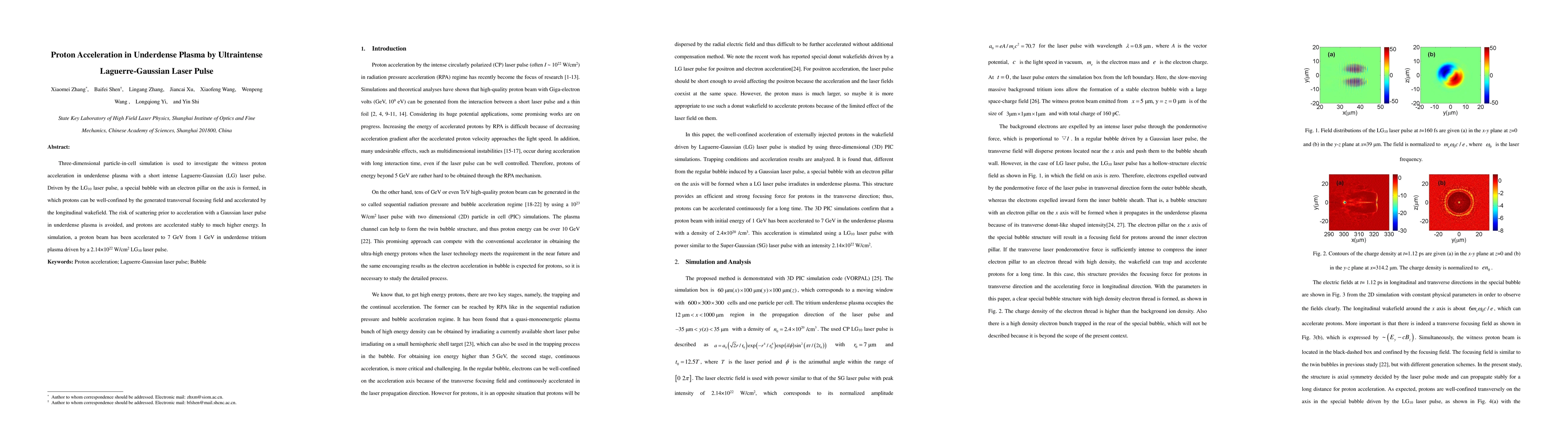 This study uses simulations to explore proton acceleration in underdense plasma using a short, ultraintense Laguerre-Gaussian laser pulse. Protons are stably accelerated to higher energies due to the formation of a special bubble with an electron pillar, avoiding scattering seen with Gaussian pulses. In simulations, protons are accelerated to 7 GeV from 1 GeV by a 2.14x10^22 W/cm^2 LG10 laser pulse in underdense tritium plasma.