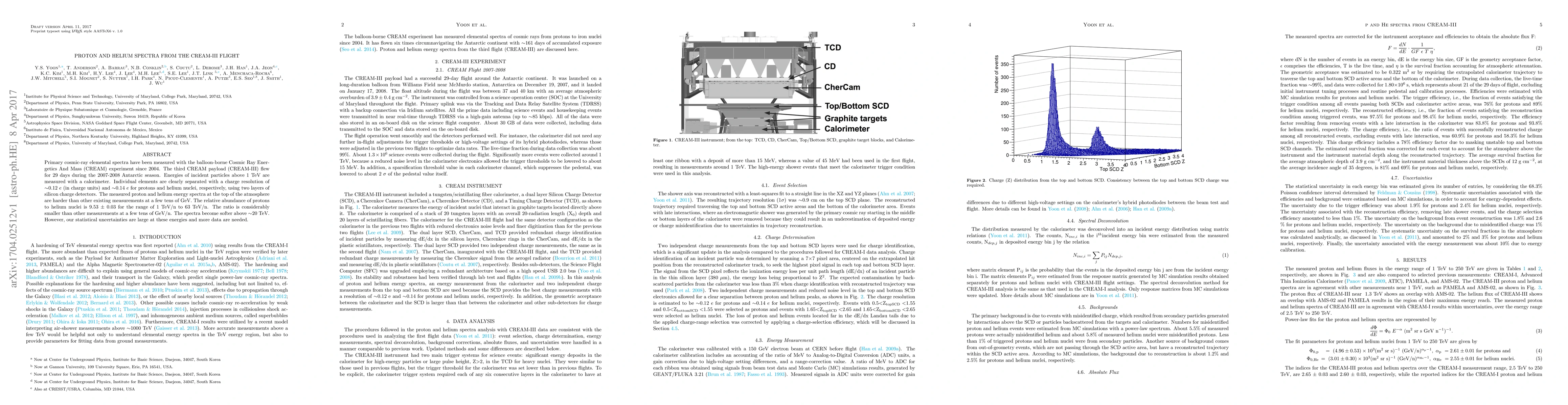 The CREAM-III experiment measured primary cosmic-ray proton and helium spectra, finding harder spectra than previous measurements at tens of GeV, with a proton-to-helium ratio of 9.53±0.03. The spectra soften above ~20 TeV, though high statistical uncertainties at these energies require more data.