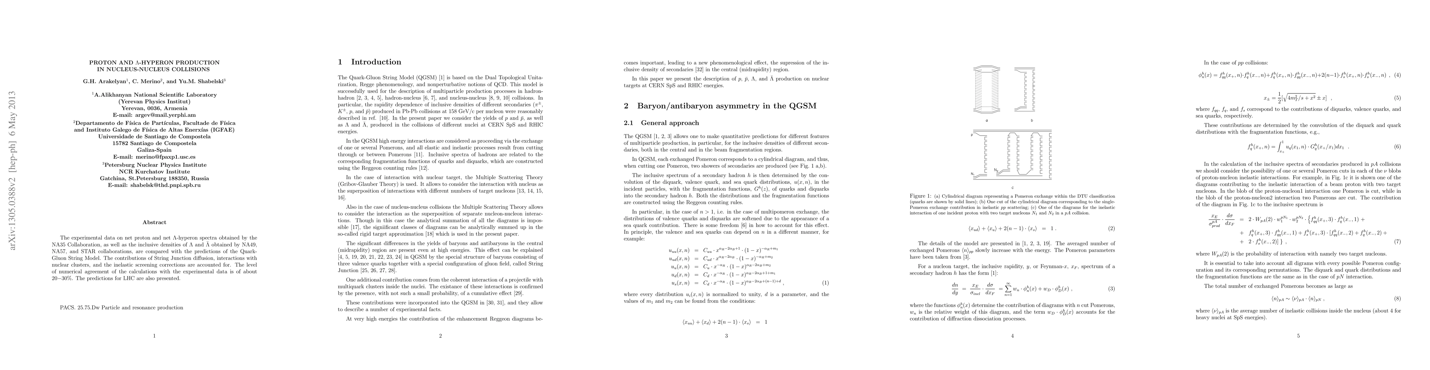 Researchers compared experimental data on proton and hyperon production in nucleus-nucleus collisions with predictions from the Quark-Gluon String Model, finding a 20-30% level of numerical agreement.