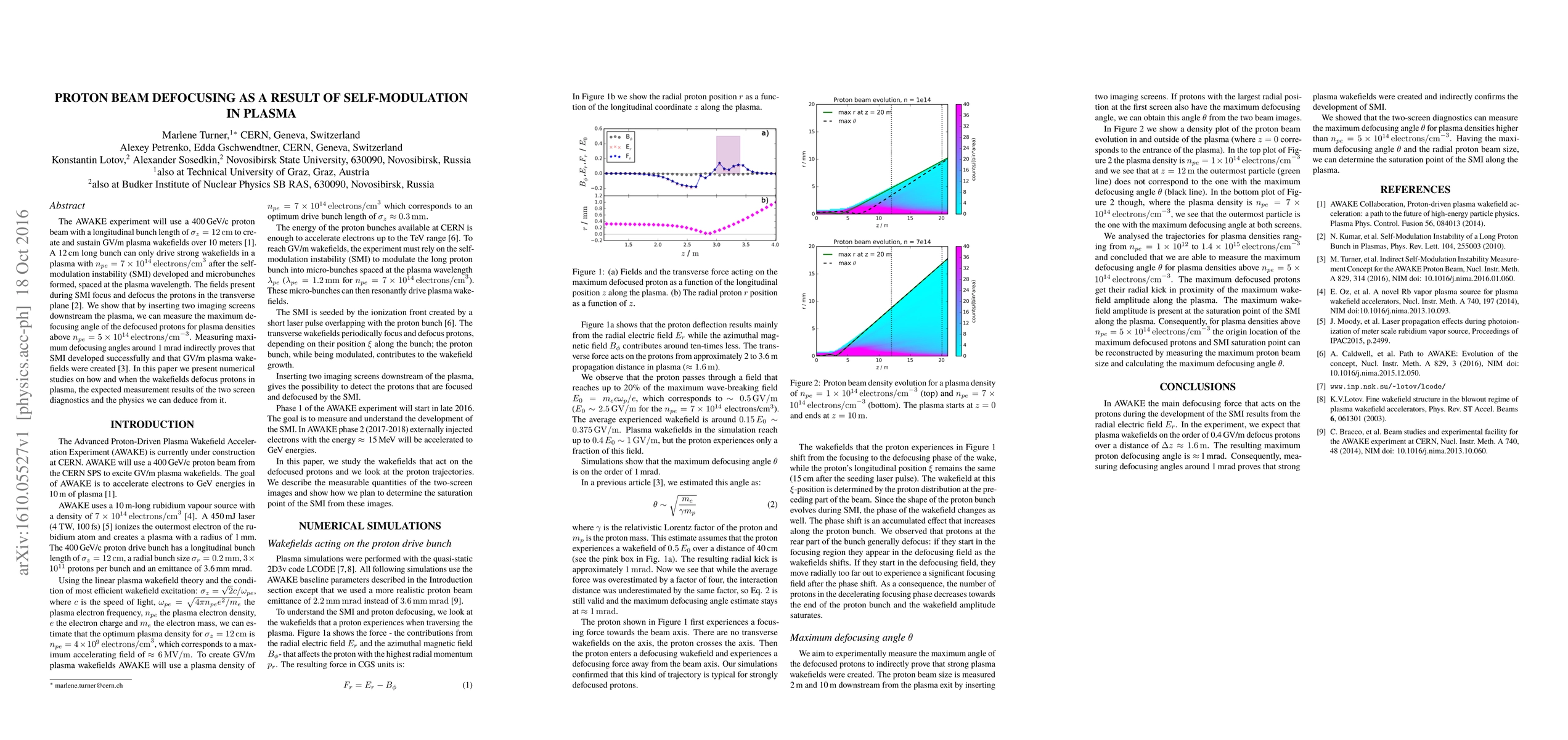 The AWAKE experiment's research demonstrates that proton beam defocusing, caused by self-modulation instability (SMI) in plasma, can be measured using imaging screens. By observing deflection angles around 1 mrad, the study confirms successful SMI and generation of GV/m plasma wakefields for plasma densities above $n_{pe} = 5 imes 10^{14}, m{electrons/cm}^{-3}$. Numerical studies explore wakefield-proton defocusing dynamics, measurement outcomes, and resulting physics insights.