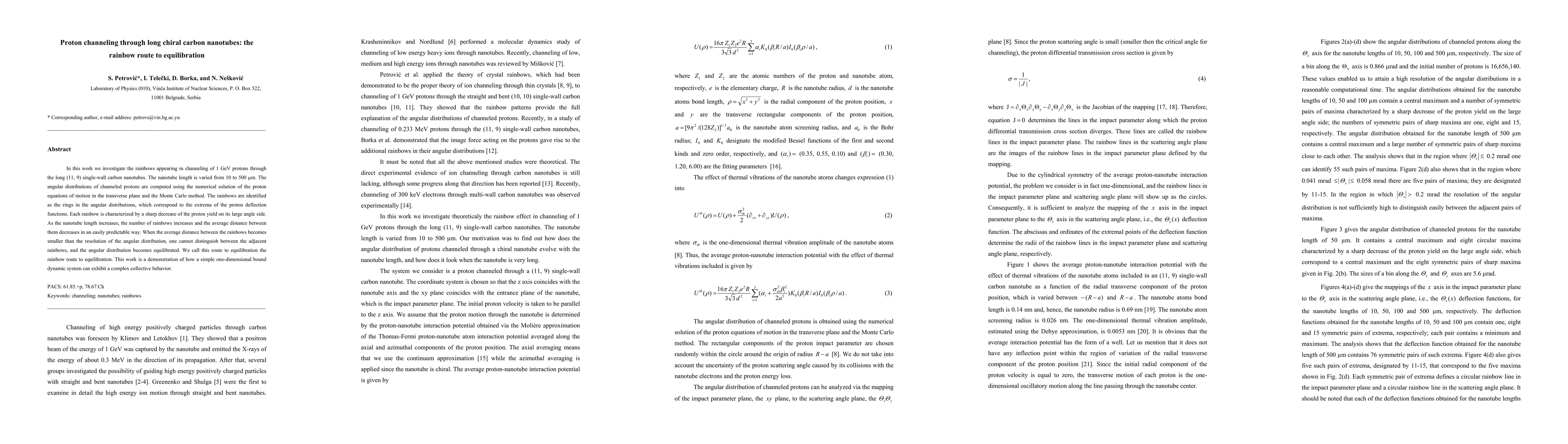 In this work we investigate the rainbows appearing in channeling of 1 GeV protons through the long (11, 9) single-wall carbon nanotubes. The nanotube length is varied from 10 to 500 micrometers. The angular distributions of channeled protons are computed using the numerical solution of the proton equations of motion in the transverse plane and the Monte Carlo method. Each rainbow is characterized by a sharp decrease of the proton yield on its large angle side. As the nanotube length increases, the number of rainbows increases and the average distance between them decreases in an easily predictable way. When the average distance between the rainbows becomes smaller than the resolution of the angular distribution, one cannot distinguish between the adjacent rainbows, and the angular distribution becomes equilibrated. We call this route to equilibration the rainbow route to equilibration. This work is a demonstration of how a simple one-dimensional bound dynamic system can exhibit a complex collective behavior.