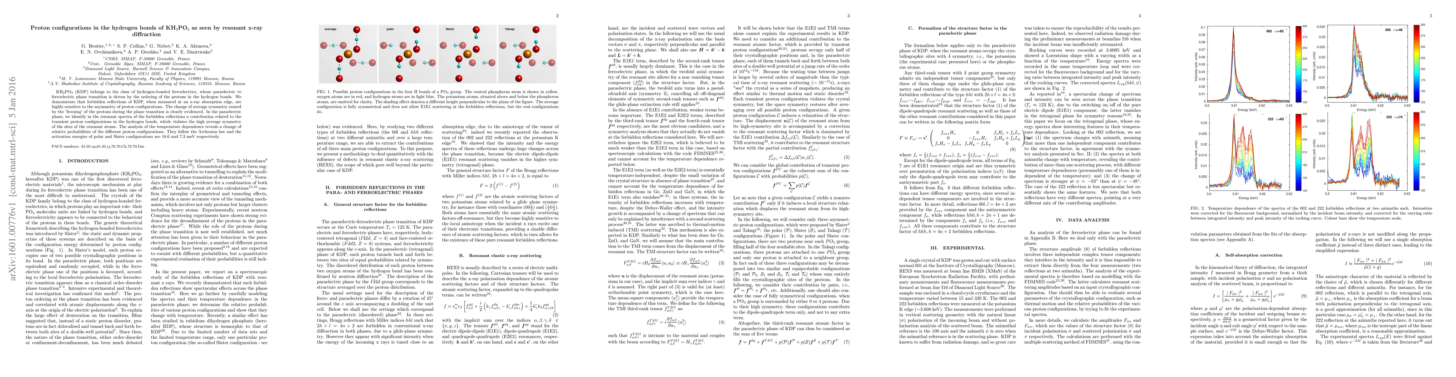 KH2PO4 (KDP) belongs to the class of hydrogen-bonded ferroelectrics, whose paraelectric to ferroelectric phase transition is driven by the ordering of the protons in the hydrogen bonds. We demonstrate that forbidden reflections of KDP, when measured at an x-ray absorption edge, are highly sensitive to the asymmetry of proton configurations. The change of average symmetry caused by the "freezing" of the protons during the phase transition is clearly evidenced. In the paraelectric phase, we identify in the resonant spectra of the forbidden reflections a contribution related to the transient proton configurations in the hydrogen bonds, which violates the high average symmetry of the sites of the resonant atoms. The analysis of the temperature dependence reveals a change of relative probabilities of the different proton configurations. They follow the Arrhenius law, and the activation energies of polar and Slater configurations are 18.6 and 7.3 meV, respectively.