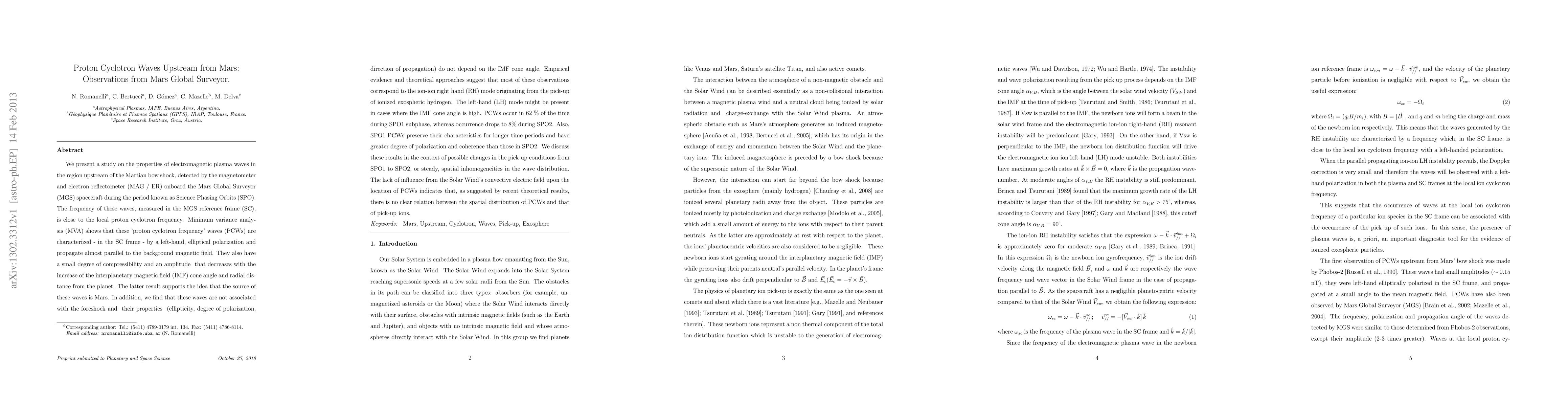 We present a study on the properties of electromagnetic plasma waves in the region upstream of the Martian bow shock, detected by the magnetometer and electron reflectometer (MAG / ER) onboard the Mars Global Surveyor (MGS) spacecraft during the period known as Science Phasing Orbits (SPO). The frequency of these waves, measured in the MGS reference frame (SC), is close to the local proton cyclotron frequency. Minimum variance analysis (MVA) shows that these 'proton cyclotron frequency' waves (PCWs) are characterized - in the SC frame - by a left-hand, elliptical polarization and propagate almost parallel to the background magnetic field. They also have a small degree of compressibility and an amplitude that decreases with the increase of the interplanetary magnetic field (IMF) cone angle and radial distance from the planet. The latter result supports the idea that the source of these waves is Mars. In addition, we find that these waves are not associated with the foreshock . Empirical evidence and theoretical approaches suggest that most of these observations correspond to the ion-ion right hand (RH) mode originating from the pick-up of ionized exospheric hydrogen. The left-hand (LH) mode might be present in cases where the IMF cone angle is high. PCWs occur in 62% of the time during SPO1 subphase, whereas occurrence drops to 8% during SPO2. Also, SPO1 PCWs preserve their characteristics for longer time periods and have greater degree of polarization and coherence than those in SPO2. We discuss these results in the context of possible changes in the pick-up conditions from SPO1 to SPO2, or steady, spatial inhomogeneities in the wave distribution. The lack of influence from the Solar Wind's convective electric field upon the location of PCWs indicates that there is no clear relation between the spatial distribution of PCWs and that of pick-up ions.