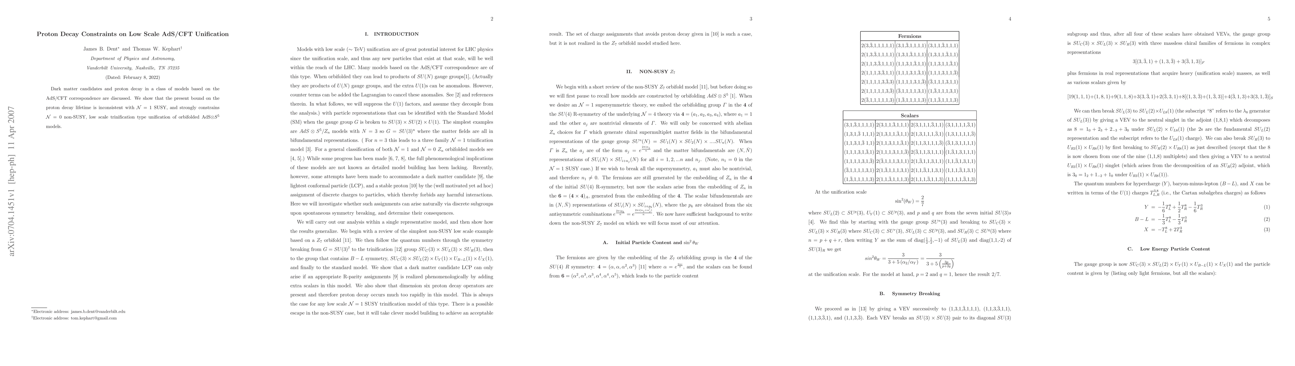 Dark matter candidates and proton decay in a class of models based on the AdS/CFT correspondence are discussed. We show that the present bound on the proton decay lifetime is inconsistent with ${\cal N} = 1$ SUSY, and strongly constrains ${\cal N} = 0$ non-SUSY, low scale trinification type unification of orbifolded AdS$\otimes S^5$ models.