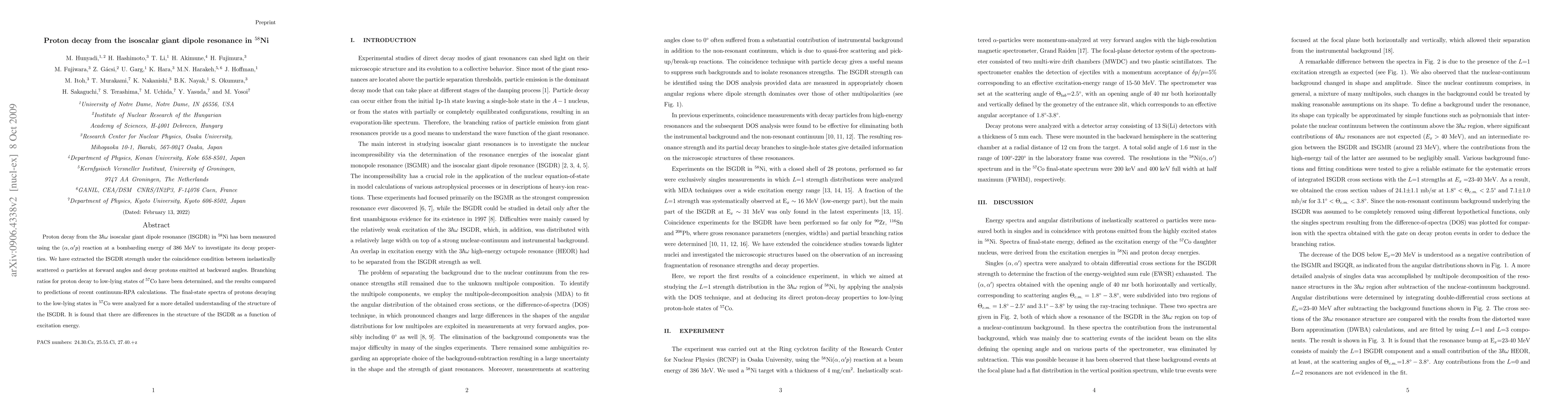 This study investigates proton decay from the isoscalar giant dipole resonance in $^{58}$Ni using the ($\alpha,\alpha'p$) reaction, revealing branching ratios for decay to low-lying states of $^{57}$Co and comparing these to continuum-RPA predictions. The results indicate structural differences in the ISGDR with varying excitation energy.