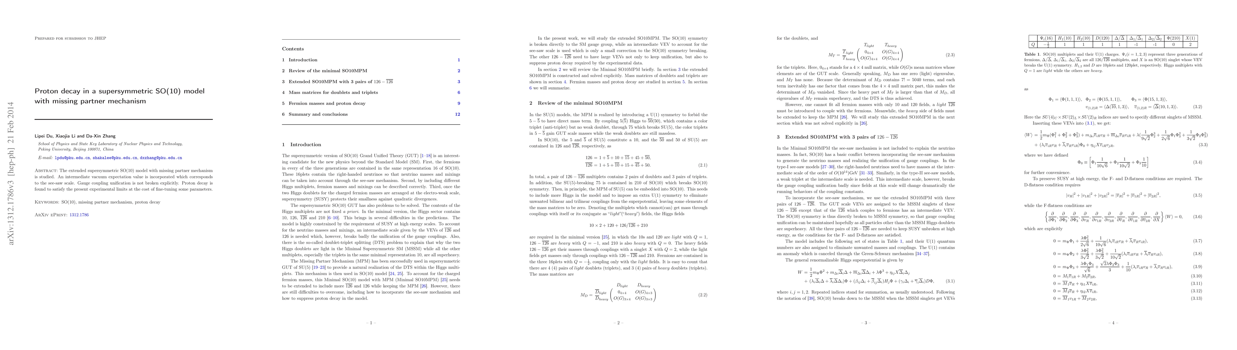 The extended supersymmetric SO(10) model with missing partner mechanism is studied. An intermediate vacuum expectation value is incorporated which corresponds to the see-saw scale. Gauge coupling unification is not broken explicitly. Proton decay is found to satisfy the present experimental limits at the cost of fine-tuning some parameters.