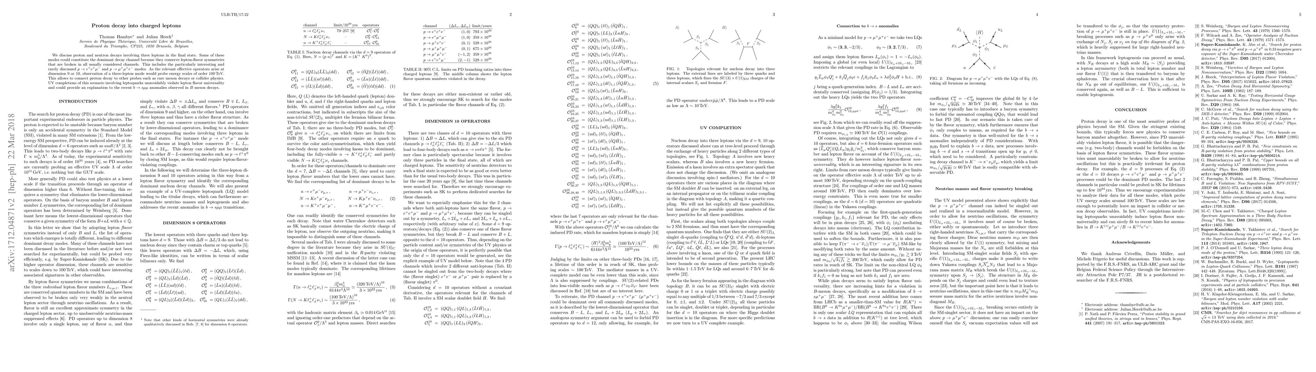 We discuss proton and neutron decays involving three leptons in the final state. Some of these modes could constitute the dominant decay channel because they conserve lepton-flavor symmetries that are broken in all usually considered channels. This includes the particularly interesting and rarely discussed $p\to e^+ e^+ \mu^-$ and $p\to \mu^+ \mu^+ e^-$ modes. As the relevant effective operators arise at dimension 9 or 10, observation of a three-lepton mode would probe energy scales of order 100 TeV. This allows to connect proton decay to other probes such as rare meson decays or collider physics. UV completions of this scenario involving leptoquarks unavoidably violate lepton flavor universality and could provide an explanation to the recent $b\to s\mu\mu$ anomalies observed in $B$ meson decays.
