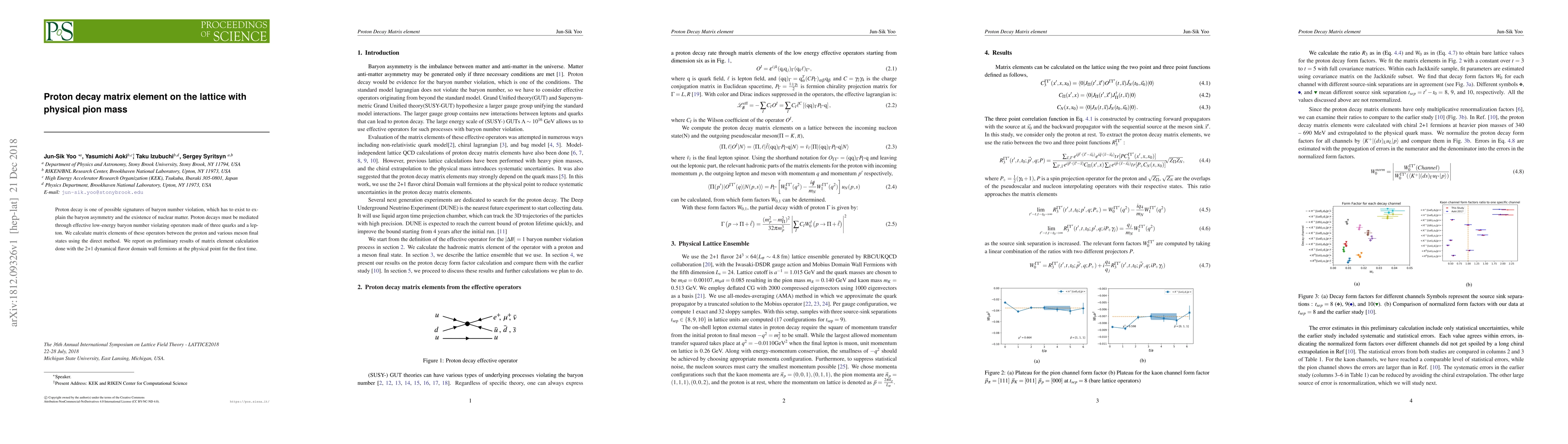 Proton decay is one of possible signatures of baryon number violation, which has to exist to explain the baryon asymmetry and the existence of nuclear matter. Proton decays must be mediated through effective low-energy baryon number violating operators made of three quarks and a lepton. We calculate matrix elements of these operators between the proton and various meson final states using the direct method. We report on preliminary results of matrix element calculation done with the 2+1 dynamical flavor domain wall fermions at the physical point for the first time.