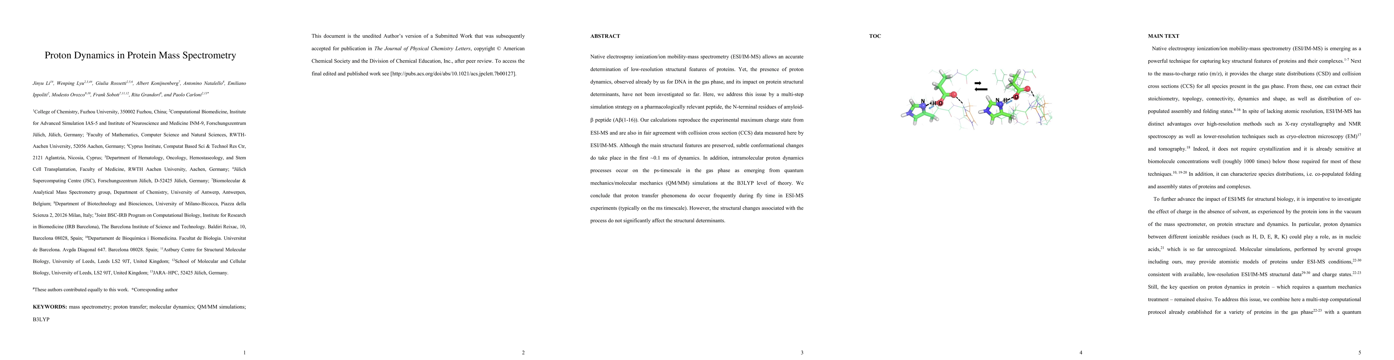 This paper investigates proton dynamics in proteins using ESI/IM-MS and simulations on amyloid-beta peptide residues. It finds that proton transfer occurs frequently during ESI-MS but does not significantly alter structural determinants.