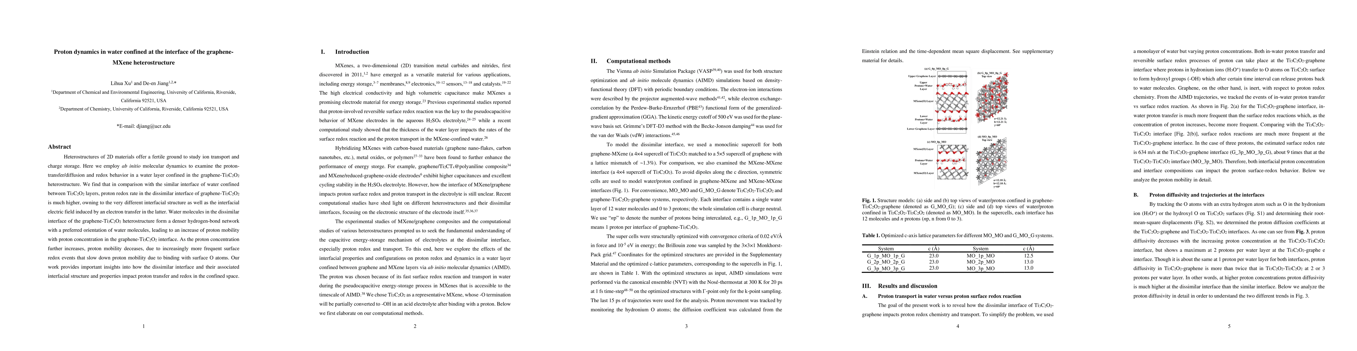 This study uses ab initio molecular dynamics to investigate proton dynamics in water confined between graphene and Ti3C2O2 layers, finding that the dissimilar interface enhances proton redox rates due to a denser hydrogen-bond network and an electric field from electron transfer, though high proton concentrations reduce mobility via surface redox events.