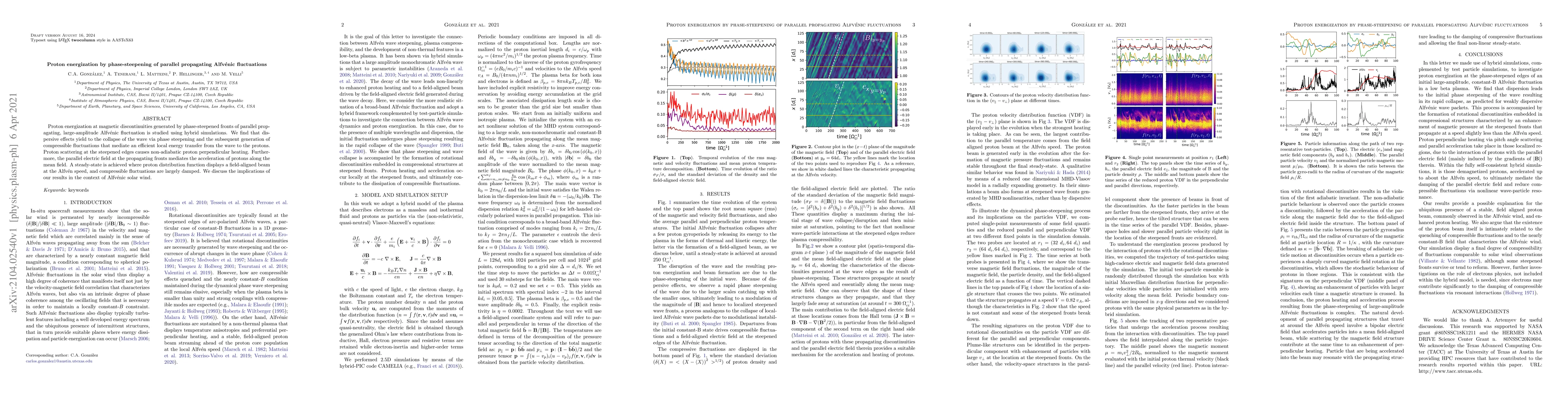 This paper investigates proton energization via phase-steepening of Alfv\'enic waves at magnetic discontinuities, revealing that dispersive effects lead to wave collapse and efficient energy transfer to protons, resulting in a field-aligned beam and implications for Alfv\'enic solar wind.