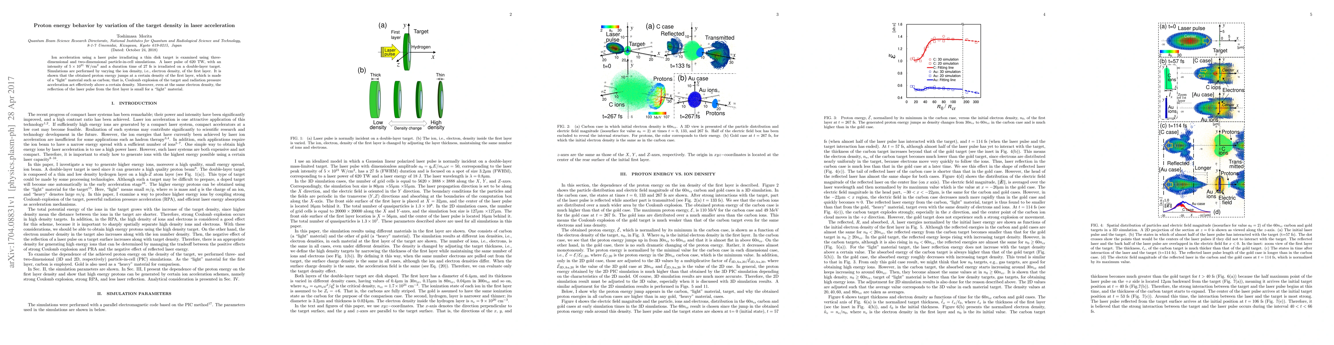 This paper investigates the proton energy behavior during laser-driven ion acceleration using simulations, finding that proton energy jumps significantly at a specific density of a "light" material target, indicating effective Coulomb explosion and radiation pressure acceleration. The study also notes minimal laser reflection for such materials.