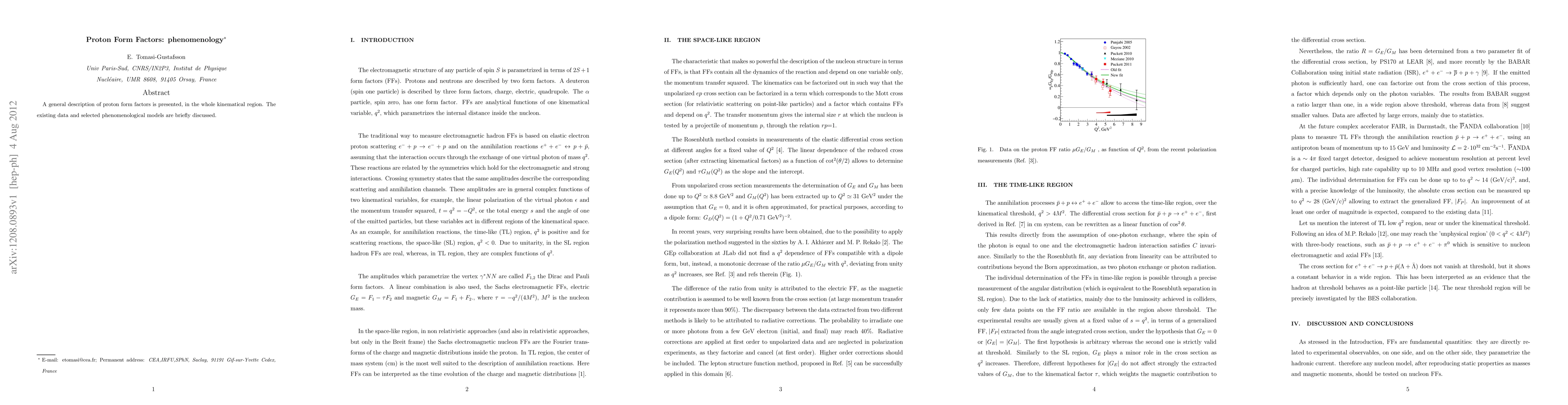 A general description of proton form factors is presented, in the whole kinematical region. The existing data and selected phenomenological models are briefly discussed.
