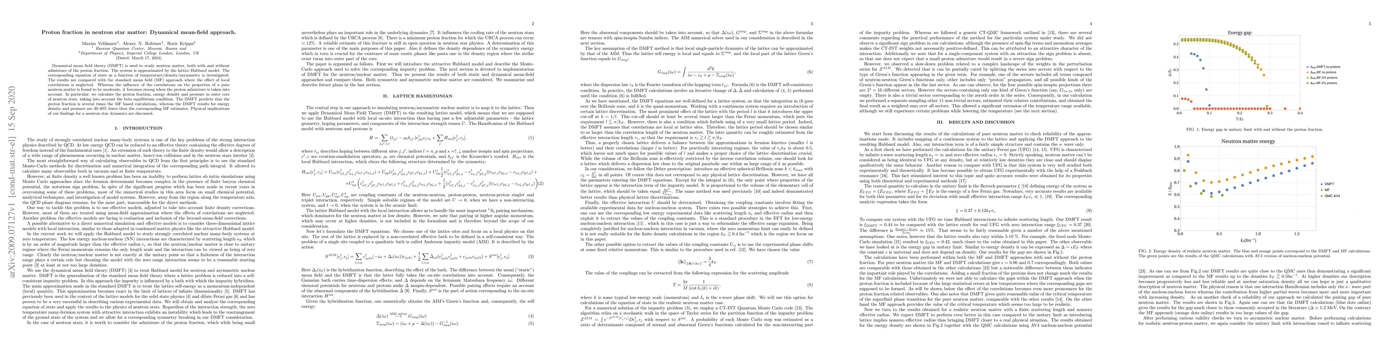 Researchers used dynamical mean field theory to study neutron star matter, finding that proton fraction is several times higher than previous estimates, while energy density and pressure were 30-40% lower.