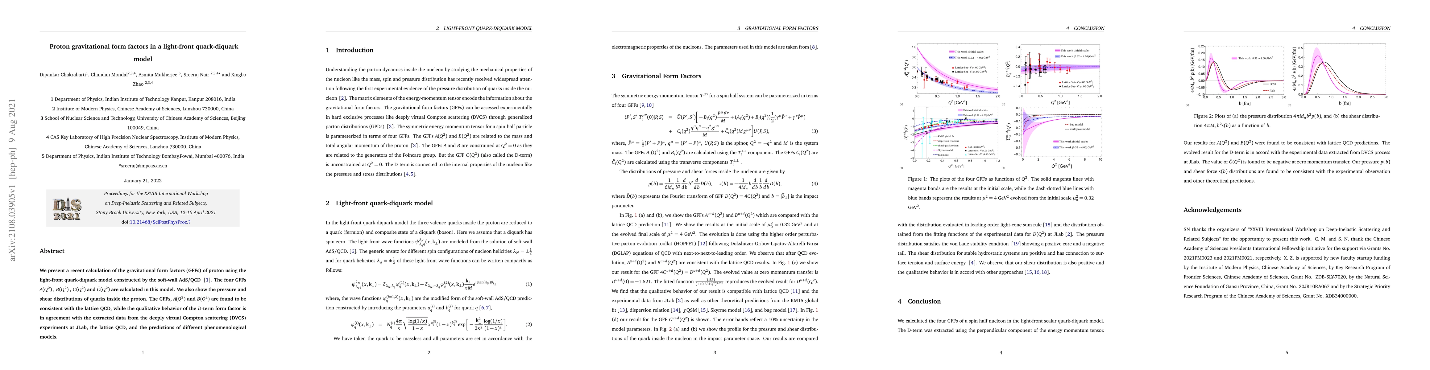 This paper calculates the proton's gravitational form factors using a light-front quark-diquark model based on soft-wall AdS/QCD, finding consistency with lattice QCD and DVCS experiment results, while also detailing quark pressure and shear distributions within the proton.
