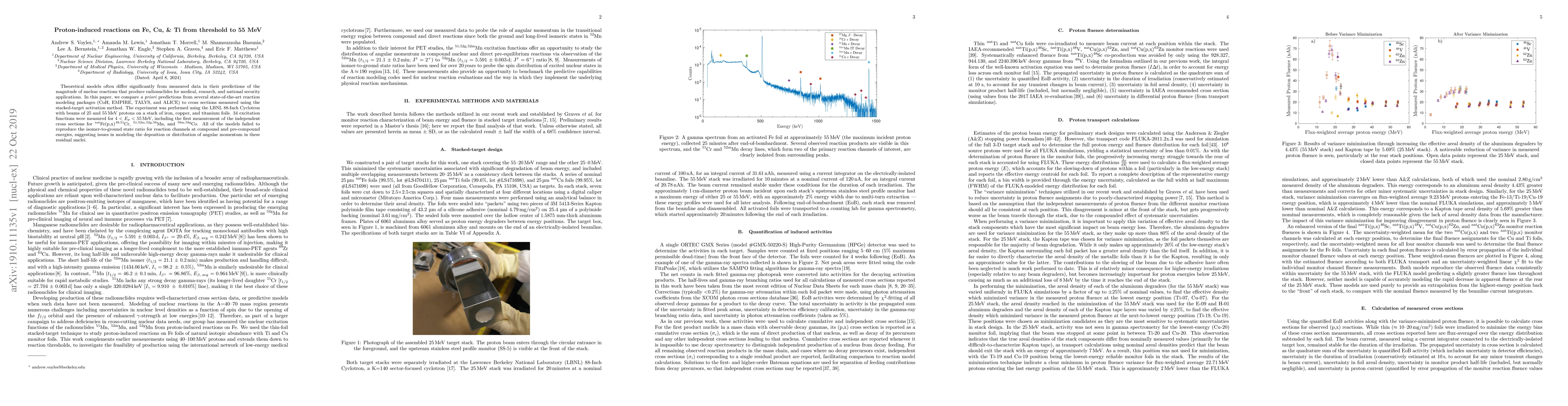 Researchers measured proton-induced reactions on iron, copper, and titanium using a cyclotron, finding that theoretical models failed to reproduce the reaction outcomes, highlighting issues with angular momentum modeling in residual nuclei.