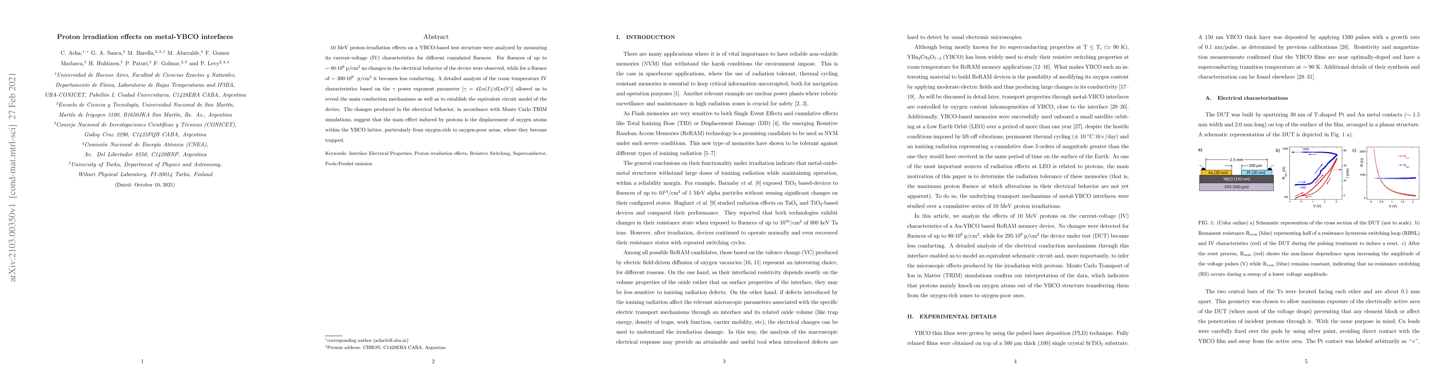 10 MeV proton-irradiation effects on a YBCO-based test structure were analyzed by measuring its current-voltage (IV) characteristics for different cumulated fluences. For fluences of up to $\sim$80$\cdot$10$^9$~p/cm$^2$ no changes in the electrical behavior of the device were observed, while for a fluence of $\sim$~300$\cdot$10$^9~$ p/cm$^2$ it becomes less conducting. A detailed analysis of the room temperature IV characteristics based on the $\gamma$ power exponent parameter [$\gamma=dLn(I)/dLn(V)$] allowed us to reveal the main conduction mechanisms as well as to establish the equivalent circuit model of the device. The changes produced in the electrical behavior, in accordance with Monte Carlo TRIM simulations, suggest that the main effect induced by protons is the displacement of oxygen atoms within the YBCO lattice, particularly from oxygen-rich to oxygen-poor areas, where they become trapped.