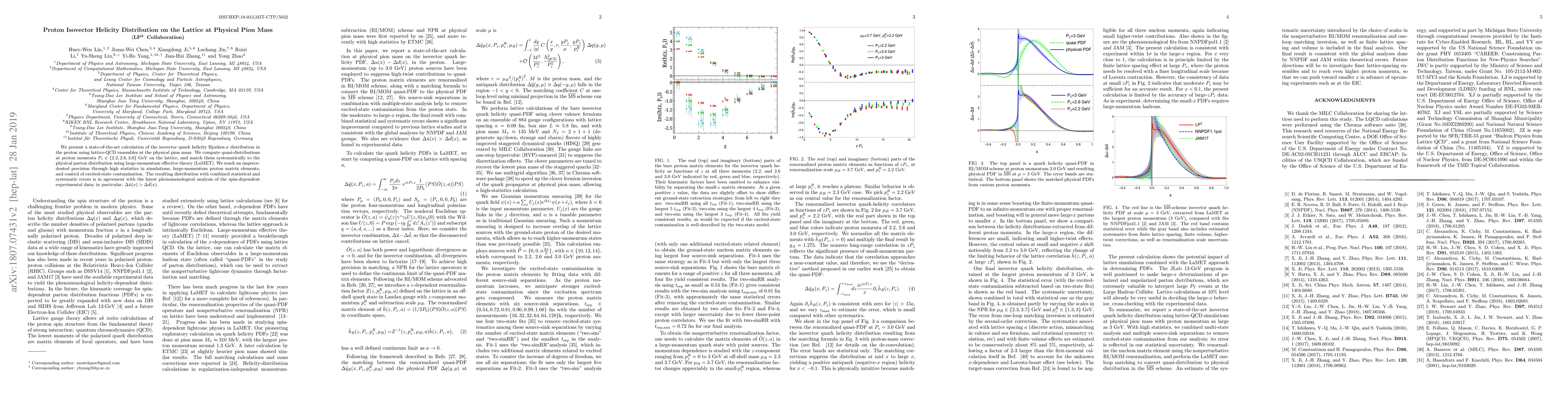 This paper reports a high-precision lattice-QCD calculation of the proton's isovector quark helicity distribution at physical pion mass, matching quasi-distributions to physical parton distributions using LaMET, and finds agreement with experimental data showing $\Delta \bar{u}(x)>\Delta \bar{d}(x)$.