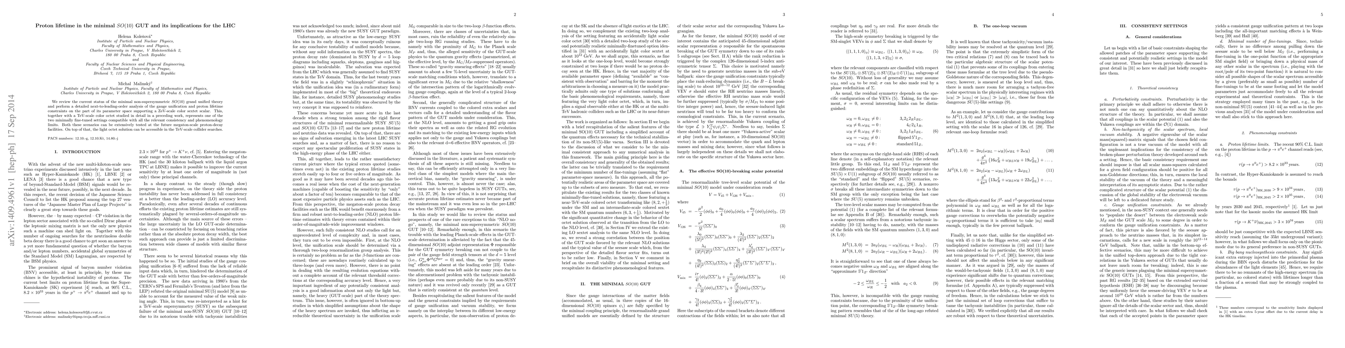 This paper reviews the minimal non-supersymmetric SO(10) grand unified theory, analyzing proton lifetime constraints and gauge unification at the ZeV-scale. The findings suggest two minimally fine-tuned scenarios, one involving a color sextet scalar and the other a color octet, both testable at future proton-decay experiments and TeV-scale colliders like the LHC.