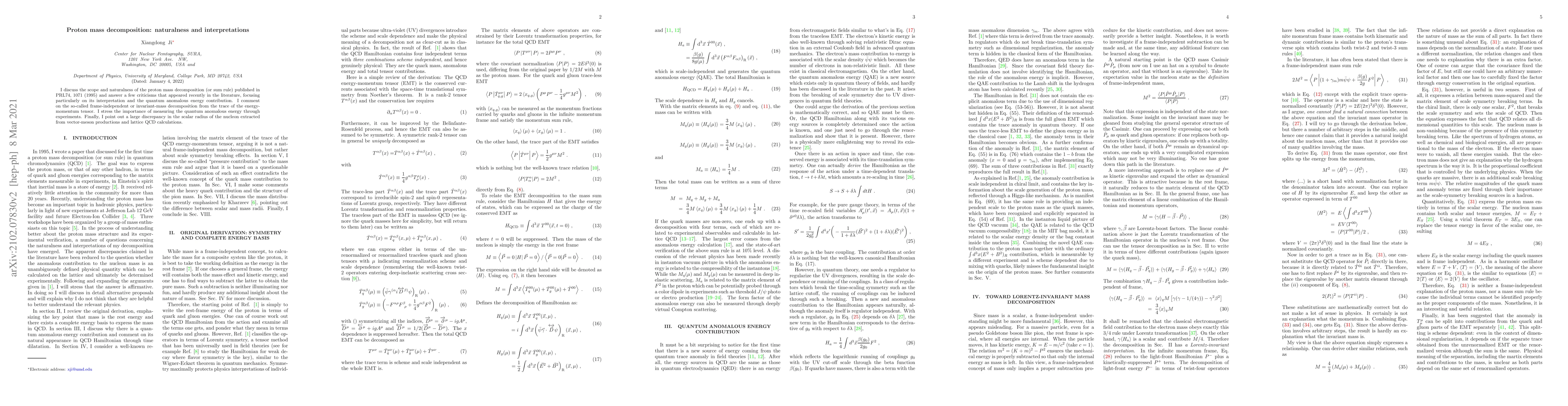 I discuss the scope and naturalness of the proton mass decomposition (or sum rule) published in PRL74, 1071 (1995) and answer a few criticisms that appeared recently in the literature, focusing particularly on its interpretation and the quantum anomalous energy contribution. I comment on the so-called frame-independent or invariant-mass decomposition from the trace of the energy-momentum tensor. I stress the importance of measuring the quantum anomalous energy through experiments. Finally, I point out a large discrepancy in the scalar radius of the nucleon extracted from vector-meson productions and lattice QCD calculations.
