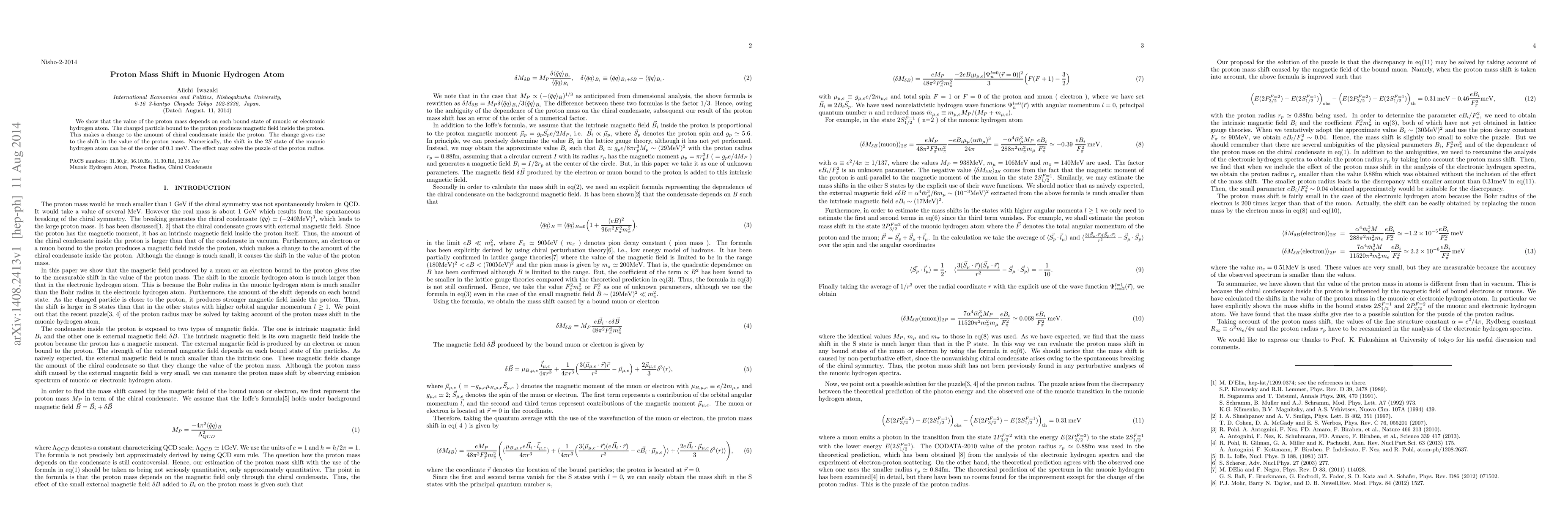 We show that the value of the proton mass depends on each bound state of muonic or electronic hydrogen atom. The charged particle bound to the proton produces magnetic field inside the proton. This makes a change to the amount of chiral condensate inside the proton. The change gives rise to the shift in the value of the proton mass. Numerically, the shift in the $2S$ state of the muonic hydrogen atom can be of the order of $0.1$ meV. The effect may solve the puzzle of the proton radius.