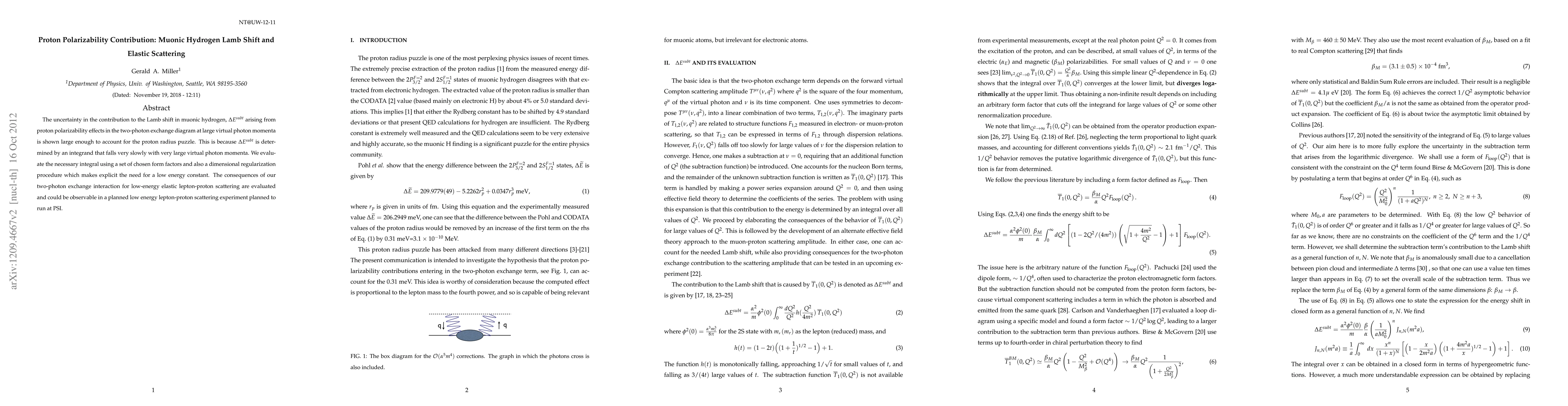 The uncertainty in the contribution to the Lamb shift in muonic hydrogen, $\Delta E^{subt}$ arising from proton polarizability effects in the two-photon exchange diagram at large virtual photon momenta is shown large enough to account for the proton radius puzzle. This is because $\Delta E^{subt}$ is determined by an integrand that falls very slowly with very large virtual photon momenta. We evaluate the necessary integral using a set of chosen form factors and also a dimensional regularization procedure which makes explicit the need for a low energy constant. The consequences of our two-photon exchange interaction for low-energy elastic lepton-proton scattering are evaluated and could be observable in a planned low energy lepton-proton scattering experiment planned to run at PSI.