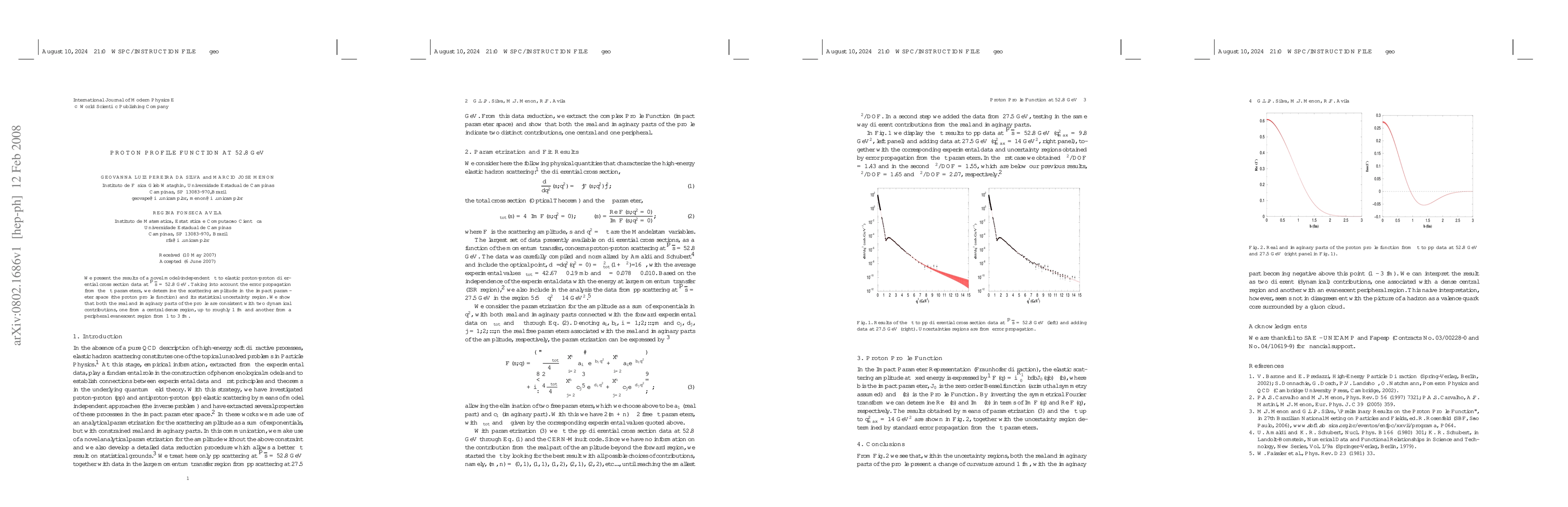 We present the results of a novel model-independent fit to elastic proton-proton differential cross section data at $\sqrt s$ = 52.8 GeV. Taking into account the error propagation from the fit parameters, we determine the scattering amplitude in the impact parameter space (the proton profile function) and its statistical uncertainty region. We show that both the real and imaginary parts of the profile are consistent with two dynamical contributions, one from a central dense region, up to roughly 1 fm and another from a peripheral evanescent region from 1 to 3 fm.