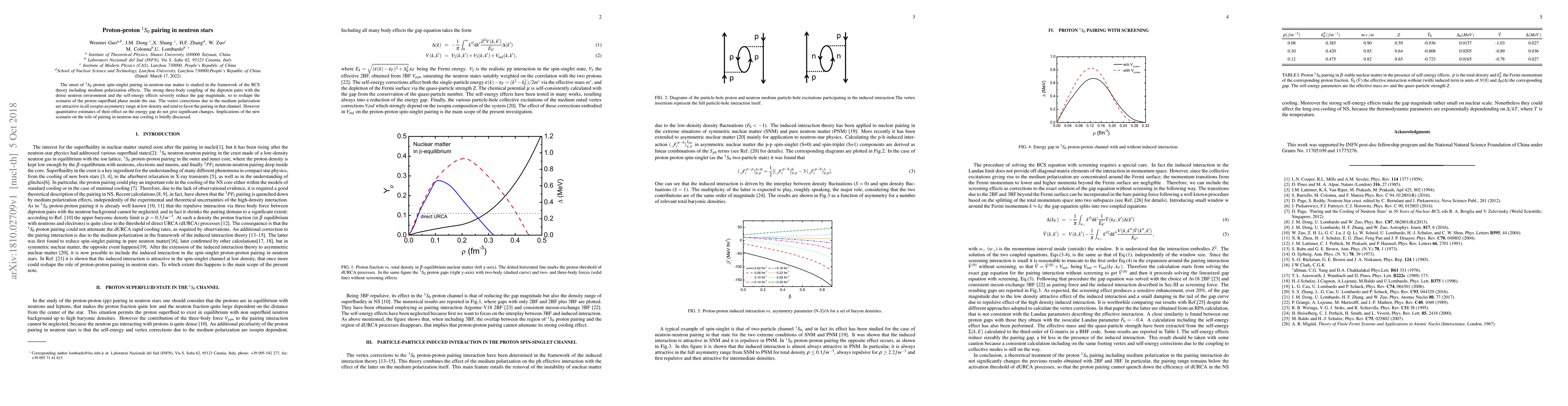 This study investigates the onset of 1S0 proton spin-singlet pairing in neutron star matter using BCS theory, revealing that strong three-body interactions and self-energy effects significantly reduce the pairing gap. Medium polarization effects favor pairing but do not significantly alter the energy gap, with implications for neutron star cooling discussed.