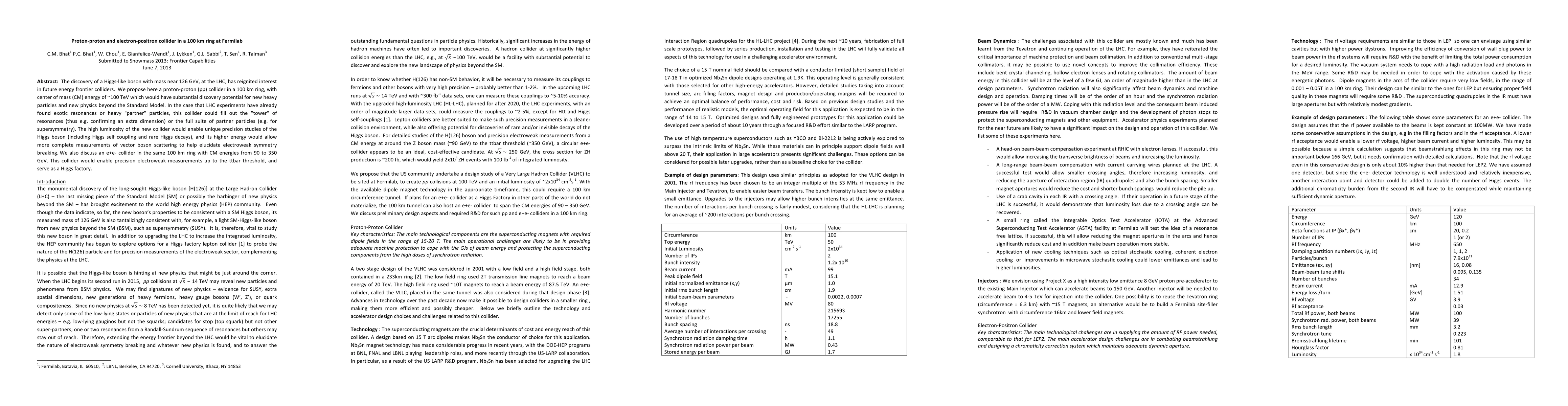 The discovery of a Higgs-like boson with mass near 126 GeV, at the LHC, has reignited interest in future energy frontier colliders. We propose here a proton-proton (pp) collider in a 100 km ring, with center of mass (CM) energy of ~100 TeV which would have substantial discovery potential for new heavy particles and new physics beyond the Standard Model. In the case that LHC experiments have already found exotic resonances or heavy "partner" particles, this collider could fill out the "tower" of resonances (thus e.g. confirming an extra dimension) or the full suite of partner particles (e.g. for supersymmetry). The high luminosity of the new collider would enable unique precision studies of the Higgs boson (including Higgs self coupling and rare Higgs decays), and its higher energy would allow more complete measurements of vector boson scattering to help elucidate electroweak symmetry breaking. We also discuss an e+e- collider in the same 100 km ring with CM energies from 90 to 350 GeV. This collider would enable precision electroweak measurements up to the ttbar threshold, and serve as a Higgs factory.