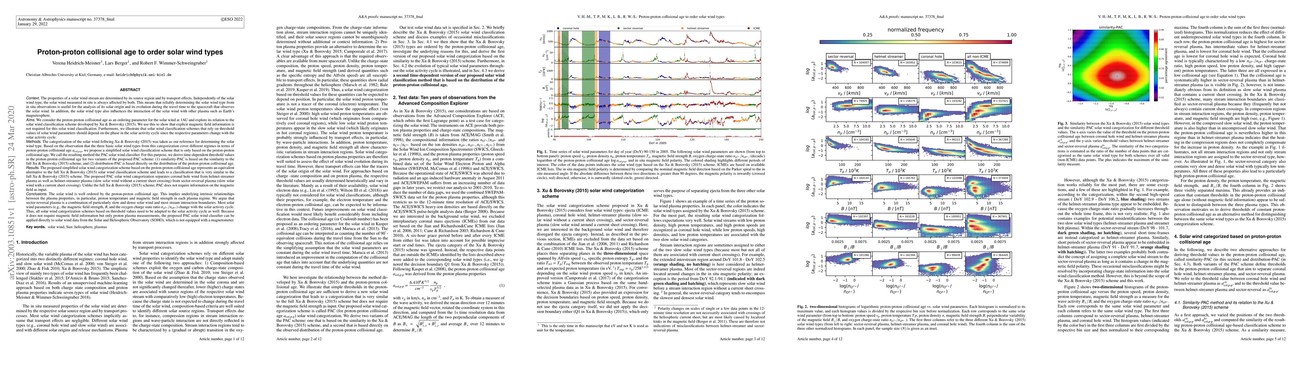 The properties of a solar wind stream are determined by its source region and by transport effects. Independently of the solar wind type, the solar wind measured in situ is always affected by both. We consider the proton-proton collisional age as an ordering parameter for the solar wind at 1AU and explore its relation to the solar wind classification scheme developed by Xu & Borovsky (2015). We use this to show that explicit magnetic field information is not required for this solar wind classification. Based on the observation that the three basic solar wind types from this categorization cover different regimes in terms of proton-proton collisional age $a_{col,p-p}$ , we propose a simplified solar wind classification scheme that is only based on the proton-proton collisional age. The resulting so-called PAC solar wind classifier is an alternative to the full Xu & Borovsky (2015) solar wind classification scheme and leads to a classification that is very similar to the full Xu & Borovsky (2015) scheme. The solar wind is well ordered by the proton-proton collisional age. This implies underlying intrinsic relationships between the plasma properties, in particular, proton temperature and magnetic field strength in each plasma regime. We argue that sector-reversal plasma is a combination of particularly slow and dense solar wind and most stream interaction boundaries. Most solar wind parameters (e.g., the magnetic field strength, B, and the oxygen charge state ratio $n_{O^{7+}}$ /$n_{O^{6+}}$) change with the solar activity cycle. Thus, all solar wind categorization schemes based on threshold values need to be adapted to the solar activity cycle as well.