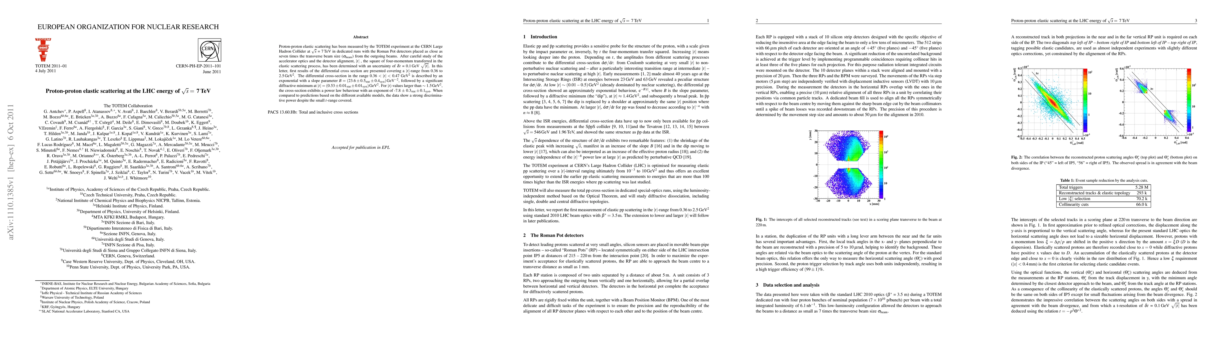 The TOTEM experiment at the LHC measured proton-proton elastic scattering at 7 TeV, determining |t| with an uncertainty of 0.1 GeV. The differential cross-section shows an exponential rise followed by a diffractive minimum, transitioning to a power law for larger |t| values.
