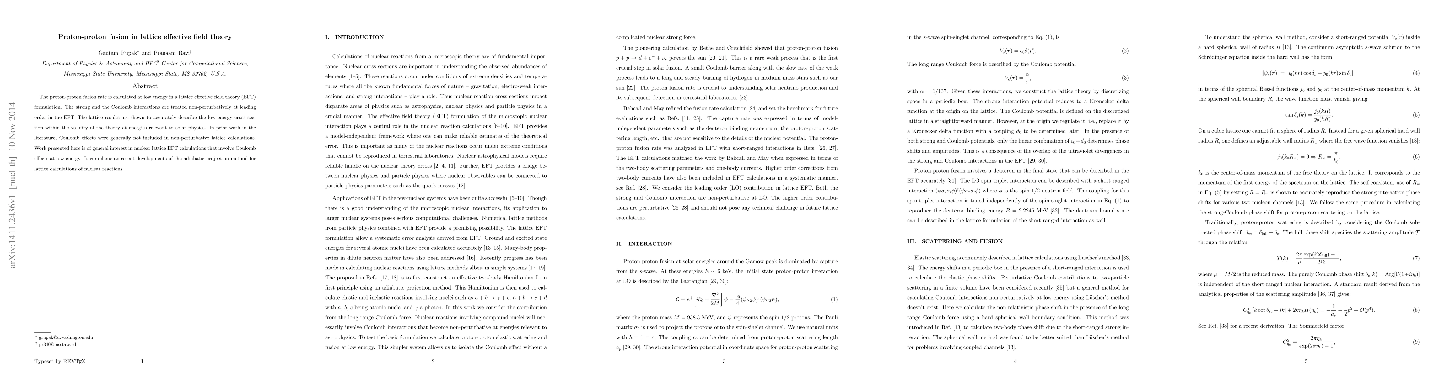 This paper calculates the proton-proton fusion rate using lattice effective field theory, treating strong and Coulomb interactions non-perturbatively. The results accurately describe the low energy cross section relevant to solar physics, including Coulomb effects not typically considered in prior lattice calculations.