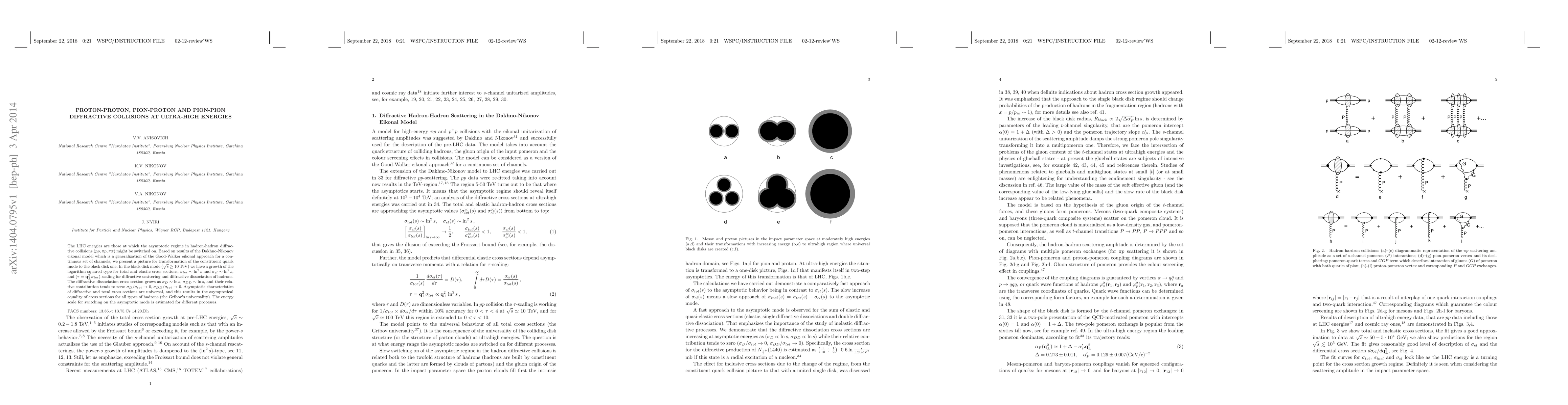 This paper investigates ultra-high energy proton-proton, pion-proton, and pion-pion collisions using the Dakhno-Nikonov eikonal model, showing that diffractive cross sections grow logarithmically with energy, leading to asymptotic universality across all types of hadrons.
