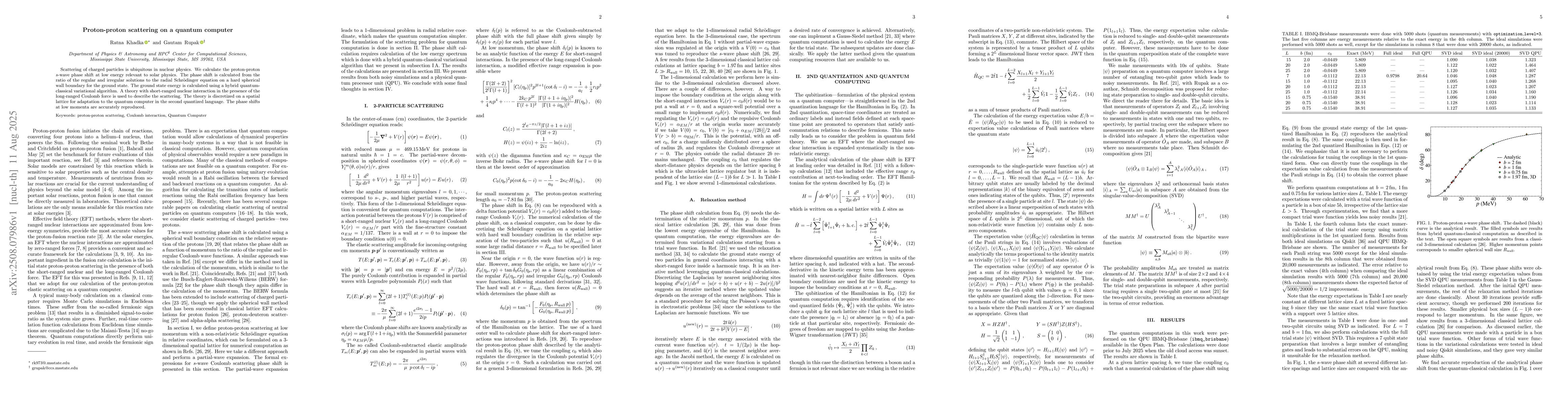 Scattering of charged particles is ubiquitous in nuclear physics. We calculate the proton-proton $s$-wave phase shift at low energy relevant to solar physics. The phase shift is calculated from the ratio of the regular and irregular solutions to the radial Schr\"odinger equation on a hard spherical wall boundary for the ground state. The ground state energy is calculated using a hybrid quantum-classical variational algorithm. A theory with short-ranged nuclear interaction in the presence of the long-ranged Coulomb force is used to describe the scattering. The theory is discretized on a spatial lattice for adaptation to the quantum computer in the second quantized language. The phase shifts at low momenta are accurately reproduced.