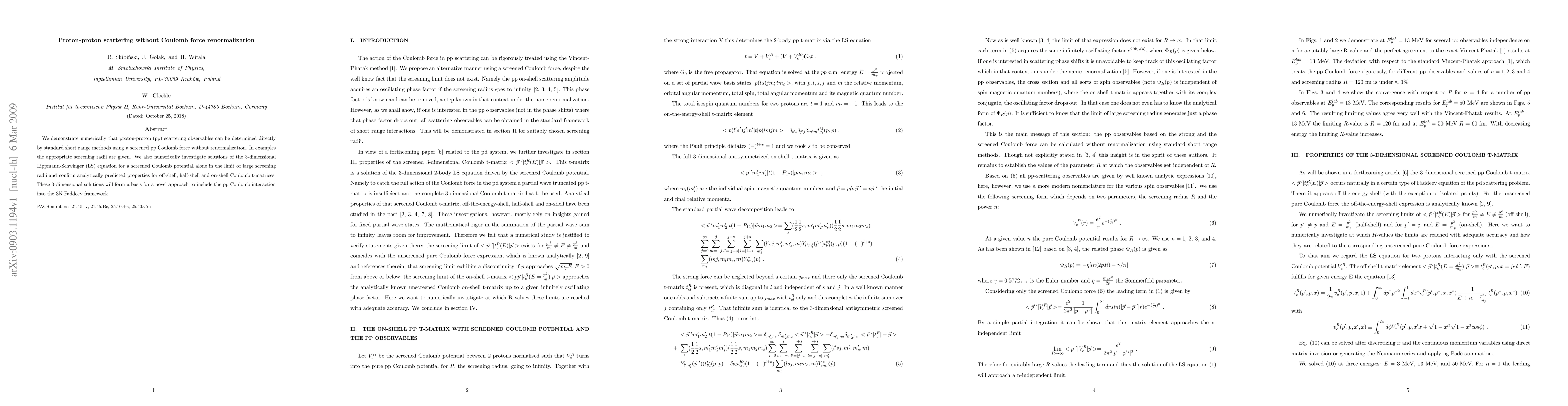 This study numerically shows that proton-proton scattering can be accurately modeled using a screened Coulomb force without requiring renormalization. The research also validates 3D Lippmann-Schwinger equation solutions for screened Coulomb potentials, supporting a new method to integrate the Coulomb interaction in three-nucleon Faddeev calculations.
