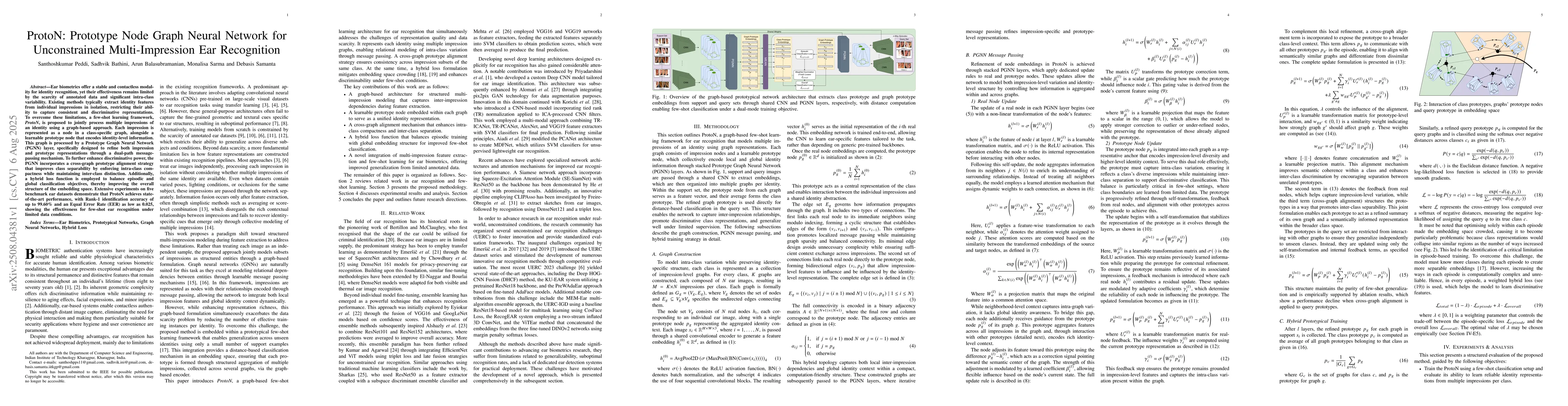 Ear biometrics offer a stable and contactless modality for identity recognition, yet their effectiveness remains limited by the scarcity of annotated data and significant intra-class variability. Existing methods typically extract identity features from individual impressions in isolation, restricting their ability to capture consistent and discriminative representations. To overcome these limitations, a few-shot learning framework, ProtoN, is proposed to jointly process multiple impressions of an identity using a graph-based approach. Each impression is represented as a node in a class-specific graph, alongside a learnable prototype node that encodes identity-level information. This graph is processed by a Prototype Graph Neural Network (PGNN) layer, specifically designed to refine both impression and prototype representations through a dual-path message-passing mechanism. To further enhance discriminative power, the PGNN incorporates a cross-graph prototype alignment strategy that improves class separability by enforcing intra-class compactness while maintaining inter-class distinction. Additionally, a hybrid loss function is employed to balance episodic and global classification objectives, thereby improving the overall structure of the embedding space. Extensive experiments on five benchmark ear datasets demonstrate that ProtoN achieves state-of-the-art performance, with Rank-1 identification accuracy of up to 99.60% and an Equal Error Rate (EER) as low as 0.025, showing the effectiveness for few-shot ear recognition under limited data conditions.
