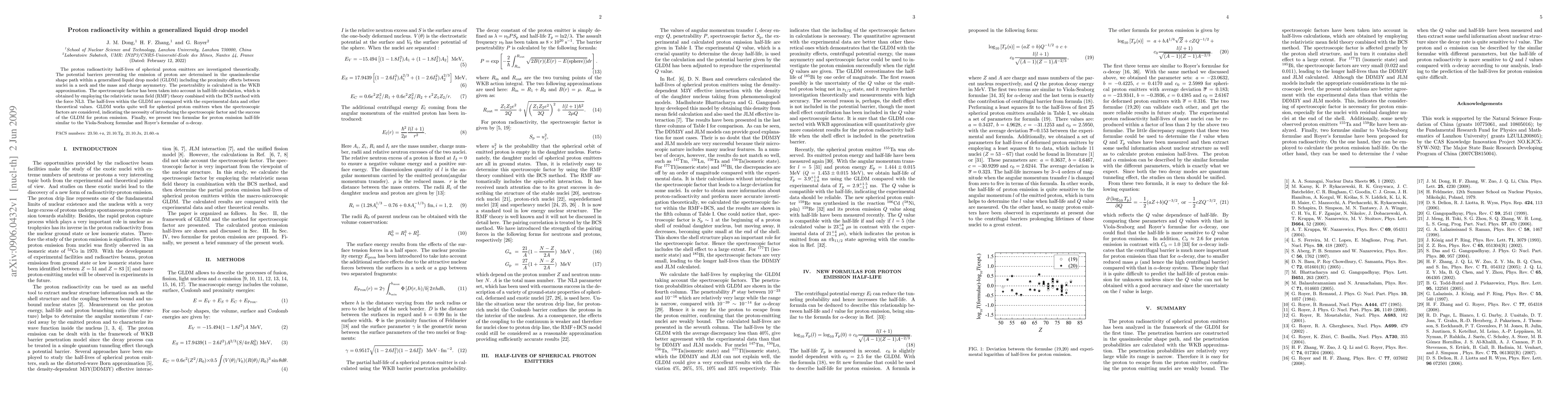 This paper investigates proton emission half-lives of spherical proton emitters using a generalized liquid drop model (GLDM) incorporating proximity effects and spectroscopic factors. The GLDM, combined with relativistic mean field theory and BCS method, shows good agreement with experimental data, validating the model's effectiveness for proton radioactivity.