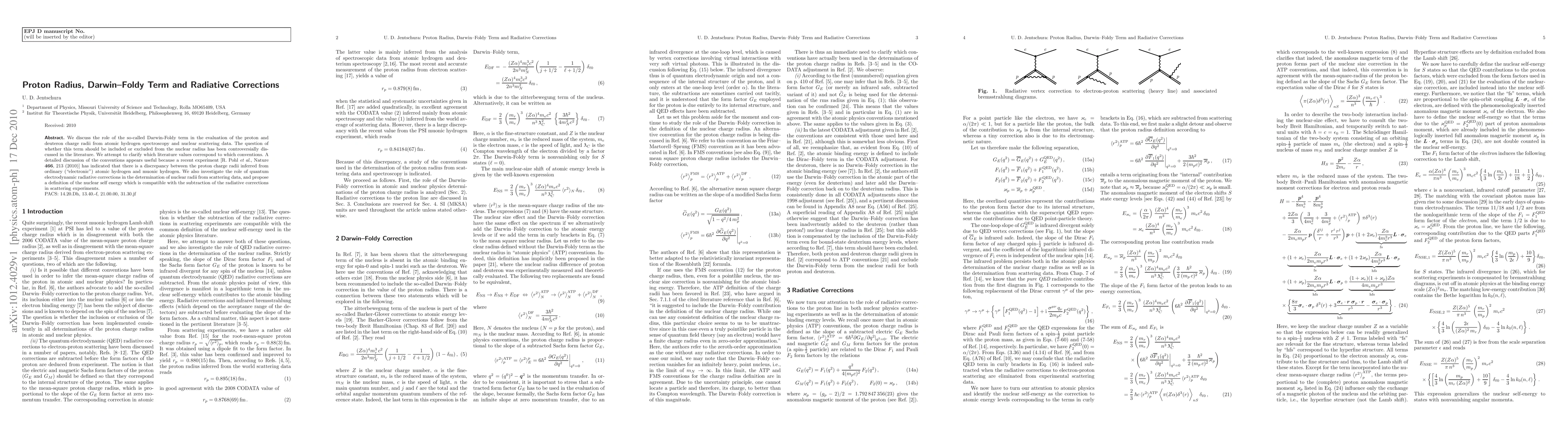 We discuss the role of the so-called Darwin-Foldy term in the evaluation of the proton and deuteron charge radii from atomic hydrogen spectroscopy and nuclear scattering data. The question of whether this term should be included or excluded from the nuclear radius has been controversially discussed in the literature. We attempt to clarify which literature values correspond to which conventions. A detailed discussion of the conventions appears useful because a recent experiment [R. Pohl et al., Nature vol. 466, p. 213 (2010)] has indicated that there is a discrepancy between the proton charge radii inferred from ordinary ("electronic") atomic hydrogen and muonic hydrogen. We also investigate the role of quantum electrodynamic radiative corrections in the determination of nuclear radii from scattering data, and propose a definition of the nuclear self energy which is compatible with the subtraction of the radiative corrections in scattering experiments.