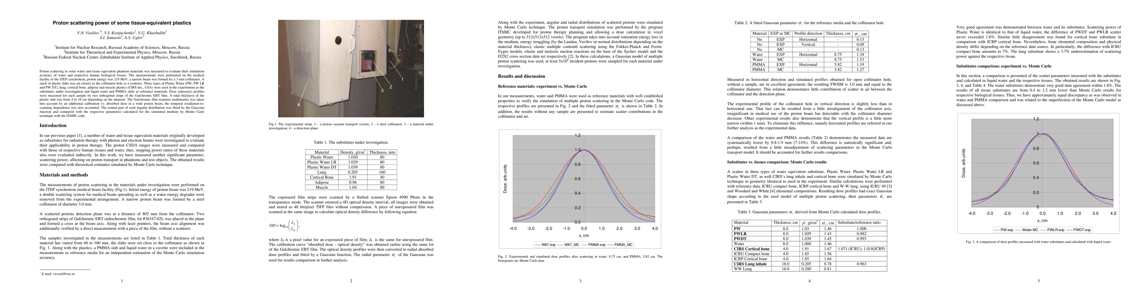 This study measures proton scattering in various tissue-equivalent plastics to evaluate their accuracy in simulating water and human tissues. Experiments at the ITEP synchrotron with 219 MeV protons revealed dose profiles using Gafchromic EBT film, comparing results with Monte Carlo simulations.