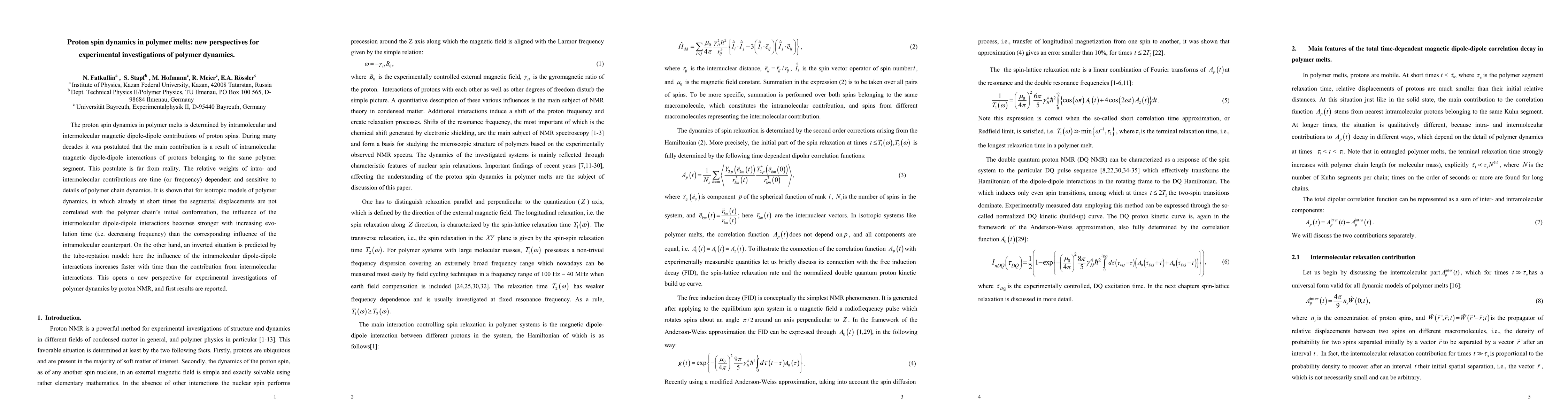 Significant progress was made in recent years in the understanding of the proton spin kinetics in polymer melts. Generally, the proton spin kinetics is determined by intramolecular and intermolecular magnetic dipole-dipole contributions of proton spins. During many decades it was postulated that the main contribution is a result of intramolecular magnetic dipole-dipole interactions of protons belonging to the same polymer segment. It appears that this postulate is far from reality. The relative weights of intra- and intermolecular contributions are time dependent and sensitive to details of polymer chain dynamics. It is shown that for isotropic models of polymer dynamics the influence of the intermolecular magnetic dipole-dipole interactions increases faster with increasing evolution time (i.e. decreasing frequency) than the corresponding influence of the intramolecular counterpart. On the other hand, an inverted situation is predicted by the tube-reptation model: here the influence of the intramolecular magnetic dipole-dipole interactions increases faster with time than the contribution from intermolecular interactions. The intermolecular contribution in the proton relaxation of polymer melts can experimentally be isolated using the isotope dilution technique and this opens a new perspective for experimental investigations of polymer dynamics by proton NMR.