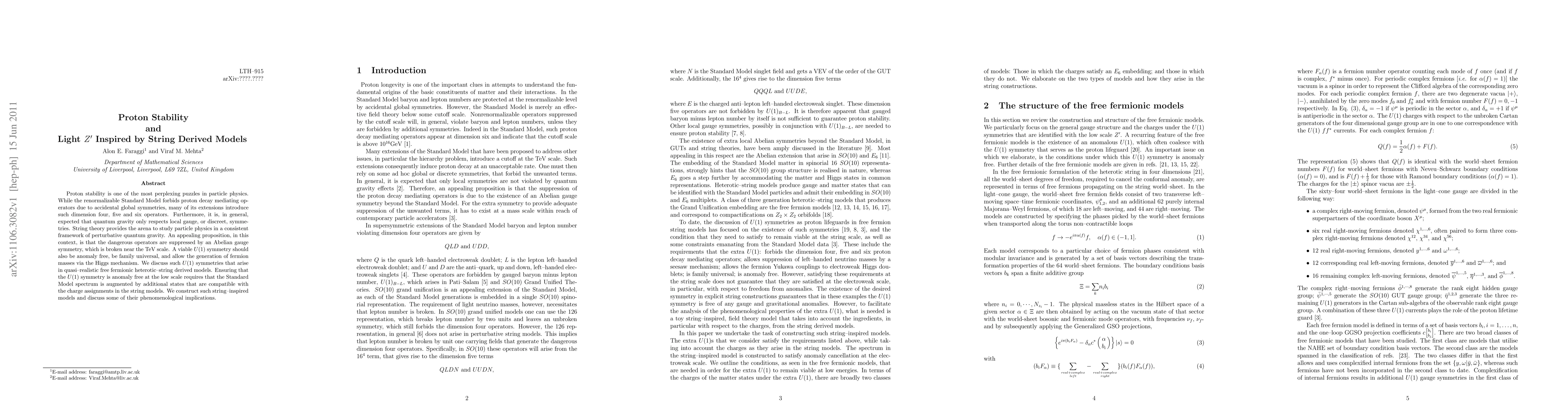 This paper explores proton stability in extensions of the Standard Model, proposing that an Abelian gauge symmetry, broken near the TeV scale, suppresses dangerous decay operators. It constructs quasi-realistic models from free fermionic heterotic string theory, ensuring anomaly freedom and fermion mass generation, and discusses their phenomenological implications.