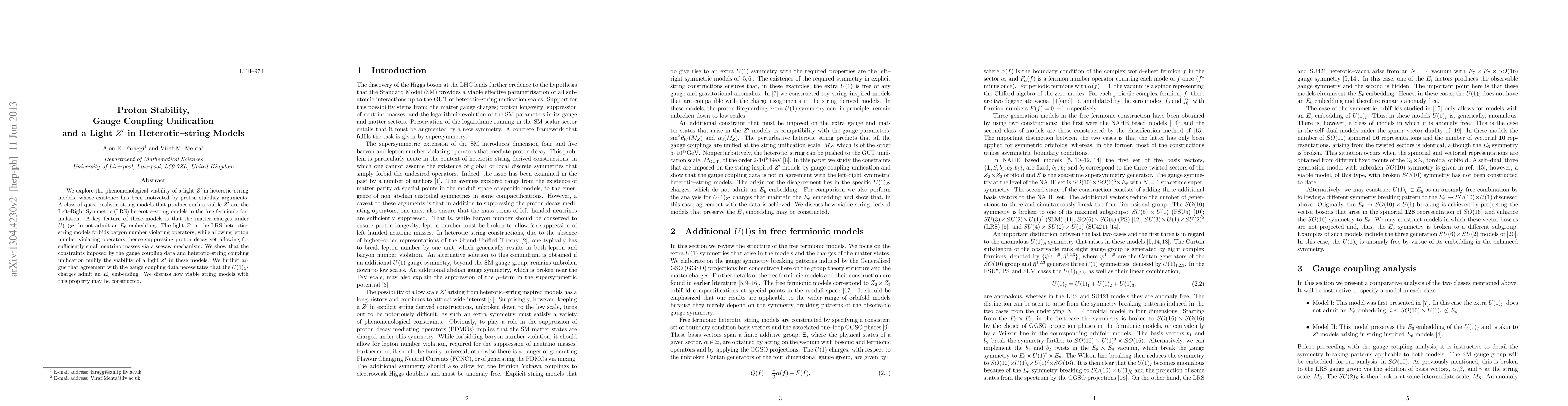 This paper investigates the possibility of a light Z' boson in heterotic-string models, driven by proton stability arguments. It finds that such models, specifically Left-Right Symmetric heterotic-string models, can suppress proton decay but face constraints from gauge coupling unification data, nullifying their viability.