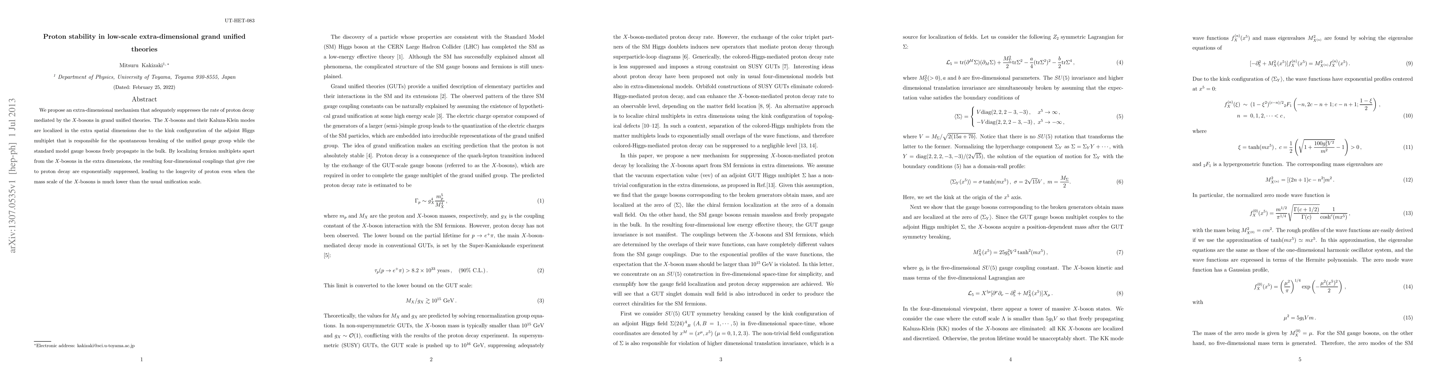 This research proposes an extra-dimensional mechanism that suppresses proton decay in grand unified theories by localizing X-bosons in extra dimensions via an adjoint Higgs multiplet. This localization suppresses the four-dimensional couplings responsible for proton decay, ensuring proton stability even at lower mass scales.