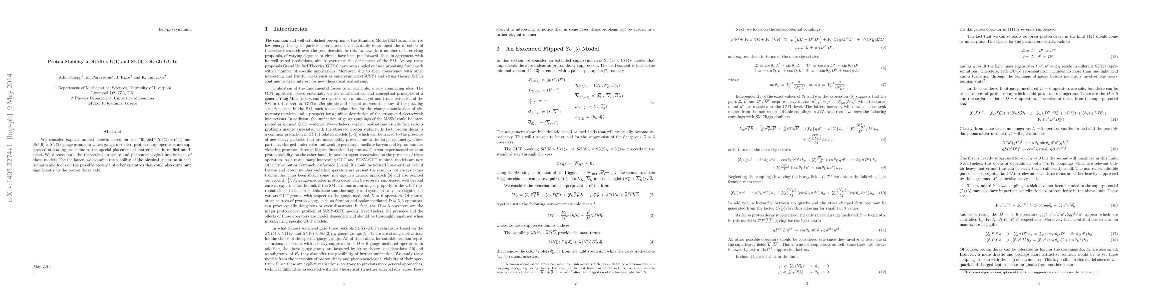 This paper investigates unified models based on $SU(5)\times U(1)$ and $SU(6)\times SU(2)$ gauge groups where proton decay is suppressed at leading order due to specific field placements. It examines the theoretical framework and phenomenological implications, assessing the viability of the physical spectrum and potential additional decay operators.