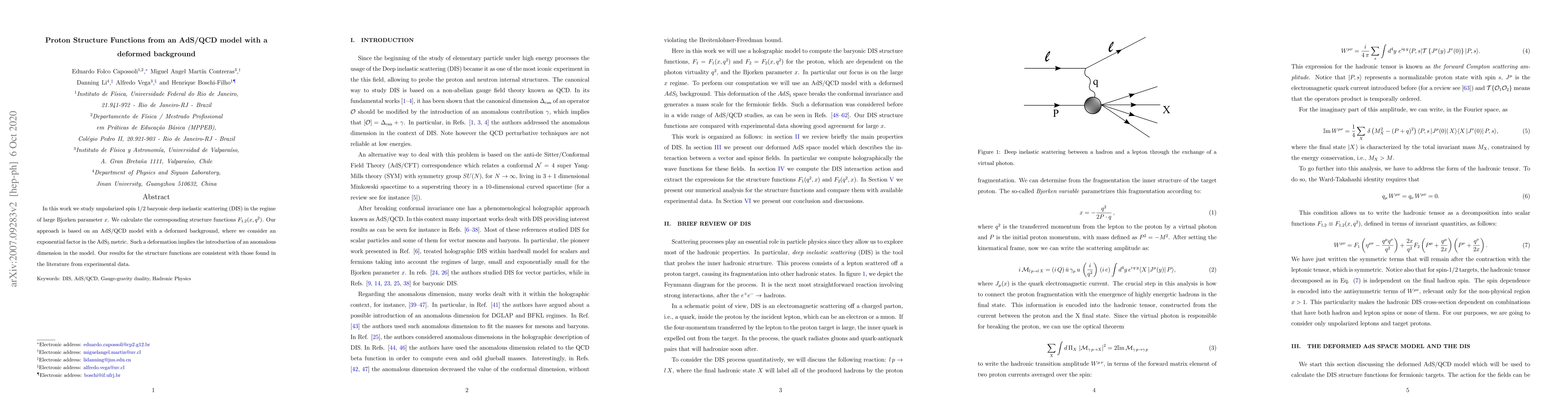This paper investigates unpolarized spin $1/2$ baryonic deep inelastic scattering in the large $x$ regime using an AdS/QCD model with a deformed background, finding consistent results for the structure functions $F_{1,2}(x,q^2)$ with experimental data. The deformation introduces an anomalous dimension in the AdS$_5$ metric.