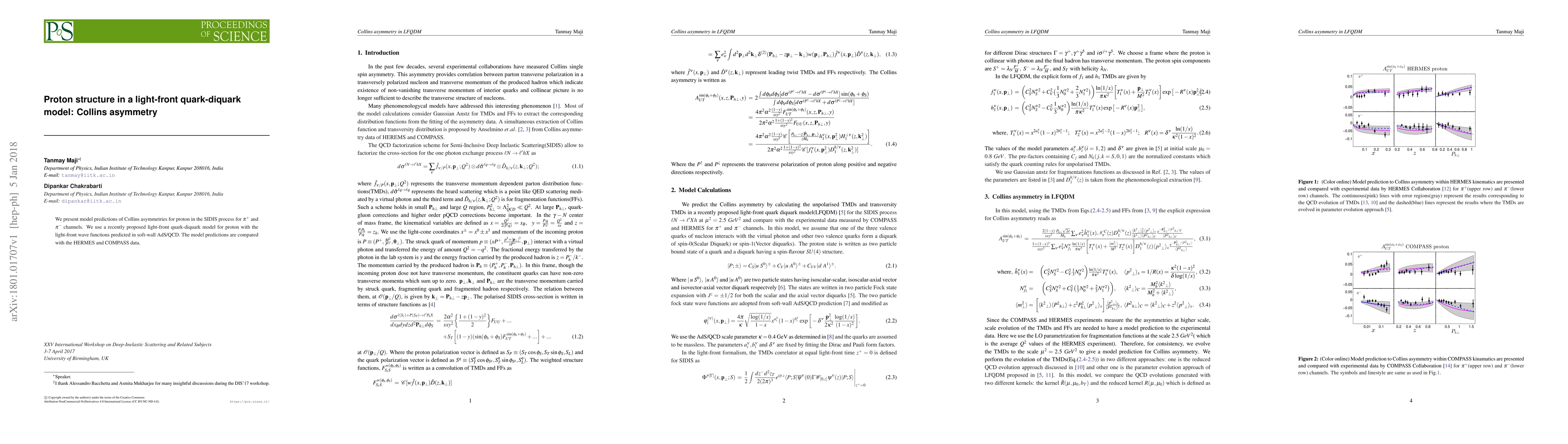 This paper investigates Collins asymmetries in the SIDIS process for proton using a light-front quark-diquark model, comparing its predictions with HERMES and COMPASS experimental data for $\pi^+$ and $\pi^-$ channels. The model employs light-front wave functions derived from soft-wall AdS/QCD.