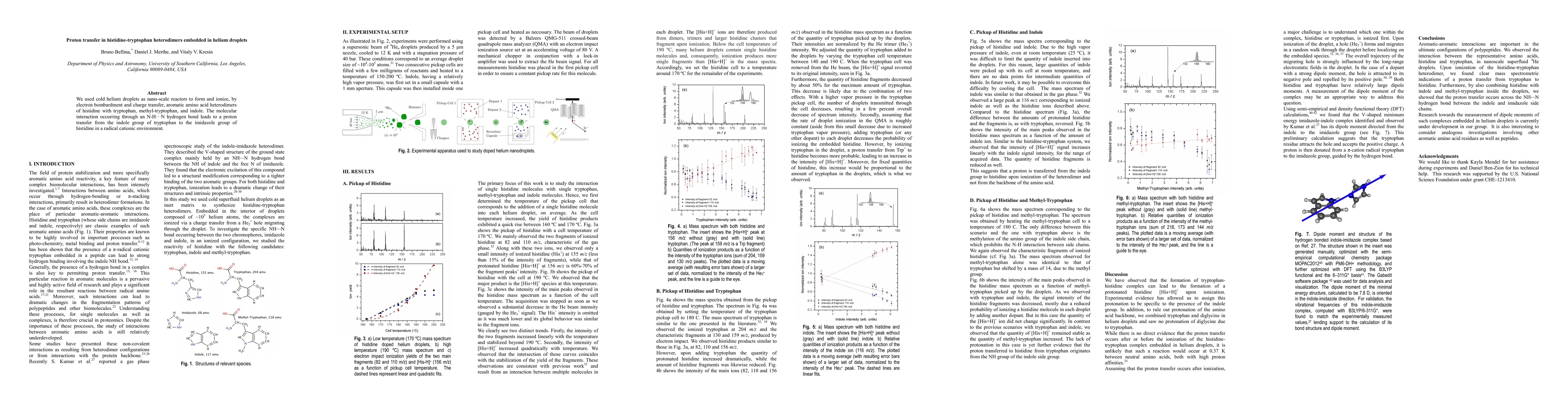We used cold helium droplets as nano-scale reactors to form and ionize, by electron bombardment and charge transfer, aromatic amino acid heterodimers of histidine with tryptophan, methyl-tryptophan, and indole. The molecular interaction occurring through an N-H...N hydrogen bond leads to a proton transfer from the indole group of tryptophan to the imidazole group of histidine in a radical cationic environment.
